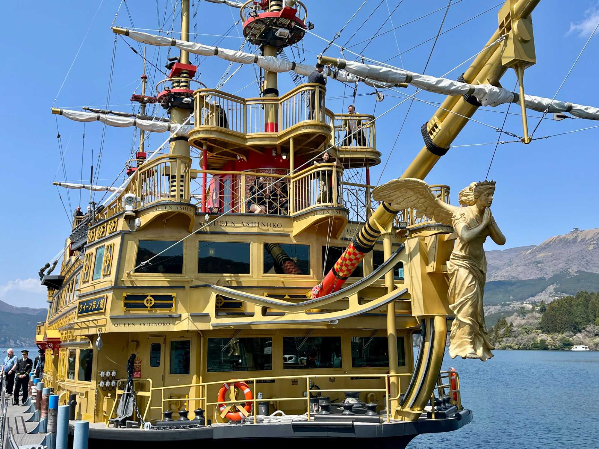 Nous montons à bord d’un téléphérique pour rejoindre le lac Ashi situé un peu plus bas. Bien organisé, des grandes cabines sont entièrement vitrées, elles peuvent accueillir jusqu’à 18 passagers et elles permettent d’avoir un panorama inédit du Mont Fuji. Le paysage est absolument magnifique ! La vue sur le lac Ashi se dévoile peu à peu. Ce lac de caldeira est l’un des lieux les plus photographiés du Japon. Ensuite, nous montons à bord d’un bateau pirate et nous pouvons maintenant voir le sommet du mont Fuji. Notre petite croisière dure environ 30 minutes. Le lac Ashi est depuis longtemps un centre de commerce essentiel de par sa position géographique, car il se trouve le long du Tôkaidô, l’ancienne route qui reliait Edo (l’actuelle Tokyo) à Kyoto. Le sanctuaire Hakone, situé au bord du lac, date de l’époque de Nara (710-94) et comptait parmi ses fidèles pèlerins des personnages illustres tels que le tout premier shogun Minamoto no Yoritomo (1147-1199). L’ancien relais de poste servait aussi de sekisho, un poste de douane important où les autorités pouvaient surveiller les déplacements vers et à partir de la capitale féodale. Depuis l’ère Meiji (1868-1912), Hakone est devenu un lieu de villégiature populaire pour les habitants de Tokyo cherchant à échapper à la frénésie de la capitale et profiter des sources thermales. Les environs comptent énormément de sites touristiques, de restaurants traditionnels et de boutiques de souvenirs.