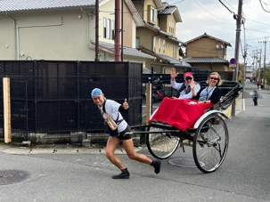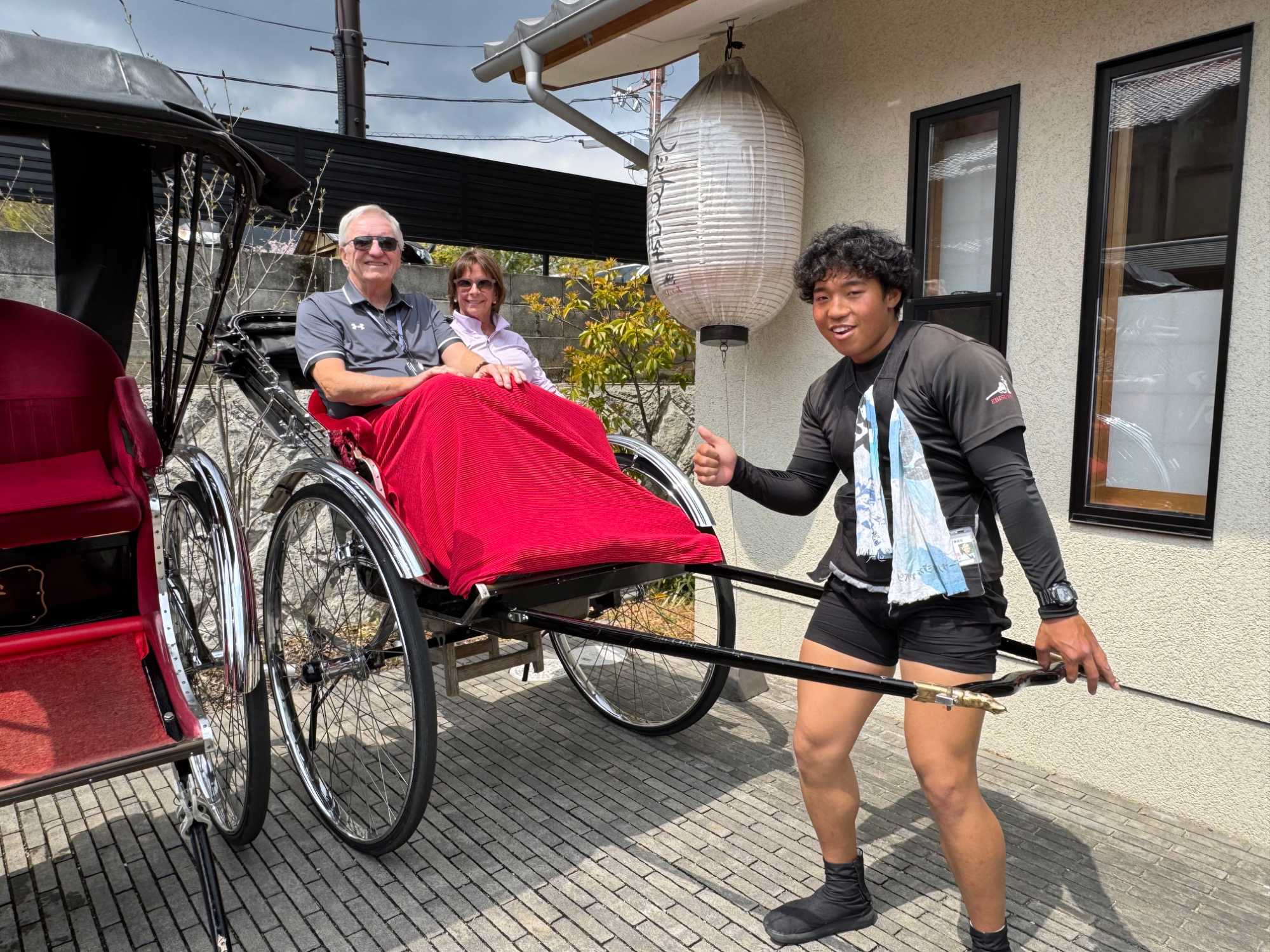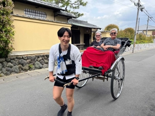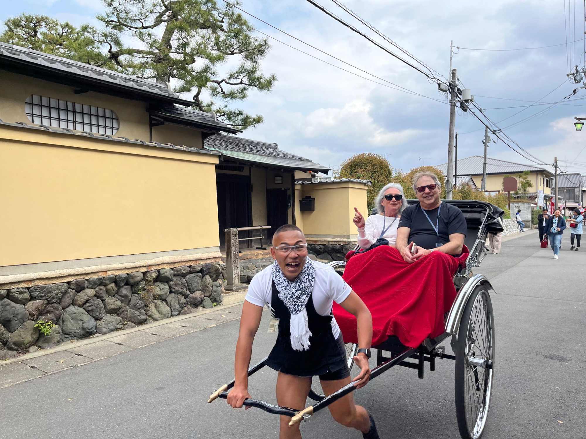 Une fois arrivés à destination, on nous entraîne le long du chemin réservé aux pousses-pousses uniquement. Nous préparons nos appareils photos. Nous pouvons prendre de superbes photos avec les magnifiques bambous verts. Le coup d’œil demeure magique et impressionnant. Les différentes nuances de vert créent une profondeur apaisante. Un bambou pousse d’environ 30 cm par jour et on peut le voir par les anneaux plus foncés identifiant chaque jour de croissance. Après avoir atteint environ 25 m, ils arrêtent de pousser en hauteur. Les bambous les plus jeunes sont d’un vert foncé et ils pâlissent en vieillissant. La forêt de bambou d’Arashiyama est la plus connue du Japon; elle est également très célèbre à travers le monde entier. Elle est également surnommée Bambouseraie de Sagano, car elle est située dans la forêt de Sagano. Plusieurs sentiers serpentent au cœur de la grande forêt de bambous, une promenade d’environ 500 mètres. Les bambous y sont vraiment impressionnants. Cette forêt d’un vert intense et très dense laisse filtrer quelques rayons de soleil. L’atmosphère est unique, relaxante et presque magique. Se retrouver au milieu de ces gigantesques arbres est impressionnant et offre un cadre magnifique. Dès notre arrivée nous sommes attendus par le responsable des « rickshaws », ces cyclo-pousses tirés par un homme, pour notre promenade dans leur bambouseraie. Une partie de la bambouseraie est privée pour eux. Le chemin se rétrécit de plus en plus. De très hauts bambous se dressent devant nous et laissent passer un filet de lumière du soleil. Aux endroits les moins denses, nous pouvons apercevoir le ciel. Nous avons la chance d’avoir de très bonnes conditions et la vue est également d’autant plus appréciable. La balade est tout simplement un coup de cœur pour tous les voyageurs et nous sommes tombés sous le charme de la ville durant notre promenade en cyclo-pousse. Le bambou est un symbole de longévité, de jeunesse, de prospérité et de force. Dans la croyance japonaise, il serait capable de repousser les mauvais esprits et les ondes négatives et pourrait également porter chance. Tant d’effets pour cette plante qui devient au final un véritable porte-bonheur.