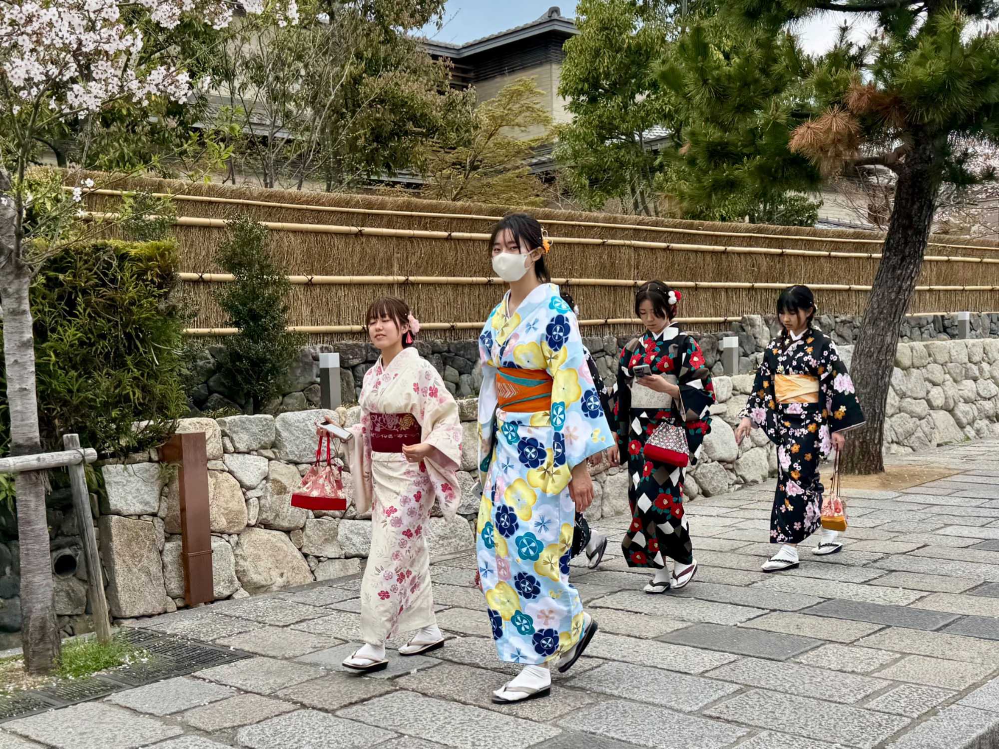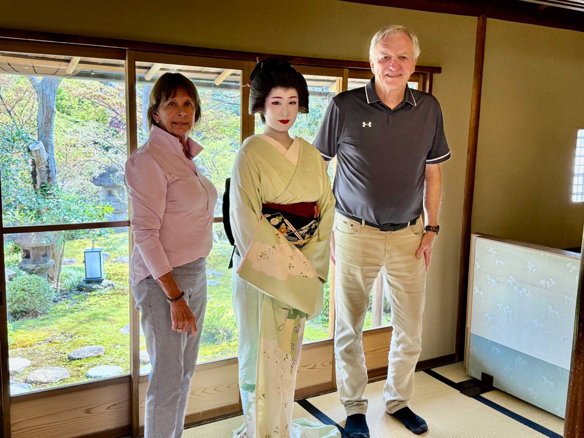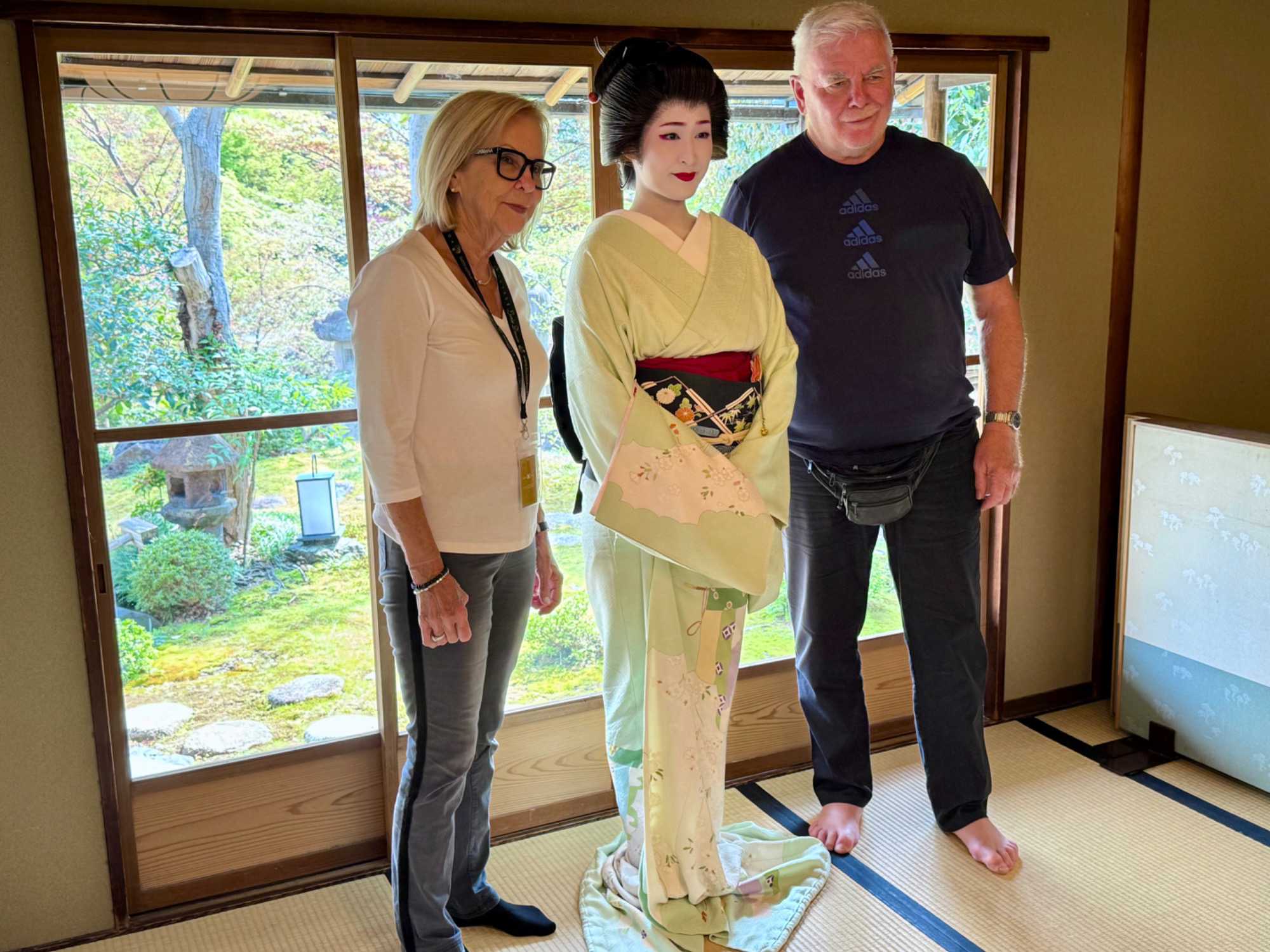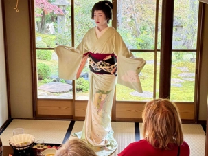 Ensuite, nous avons la chance d’avoir un spectacle de danse traditionnelle assuré par une Geiko, c’est de cette manière qu’on appelle les Geisha dans la région de Kyoto. Les Geisha sont des artistes traditionnelles japonaises spécialisées dans les arts de la danse et de la musique. Les Geikos étudient les arts pendant cinq années avant d’obtenir leur titre officiel. Nous sommes captivés par sa grâce, sa retenue, et le sérieux qu’elle y met. Jean nous explique toute la complexité du parcours d’une maiko vers le titre très prisé de Geiko. La longueur des manches, la coiffure, son maquillage, traduit les moindres échanges avec une précision suscitant l’admiration des spectateurs. Nous nous sentons privilégiés de vivre un tel moment impressionnant de la culture japonaise. Puis, nous visitons le jardin zen situé juste à l’arrière du restaurant.
