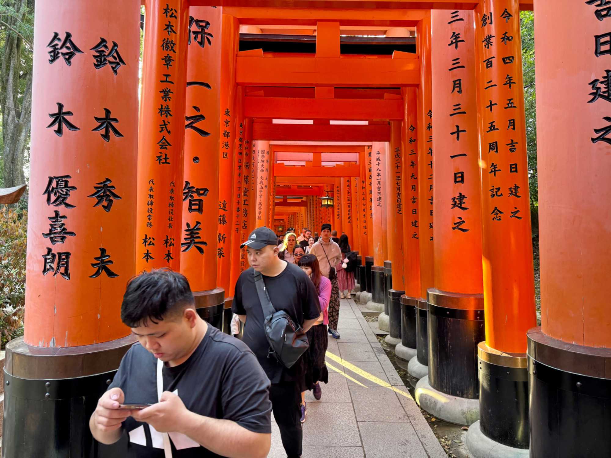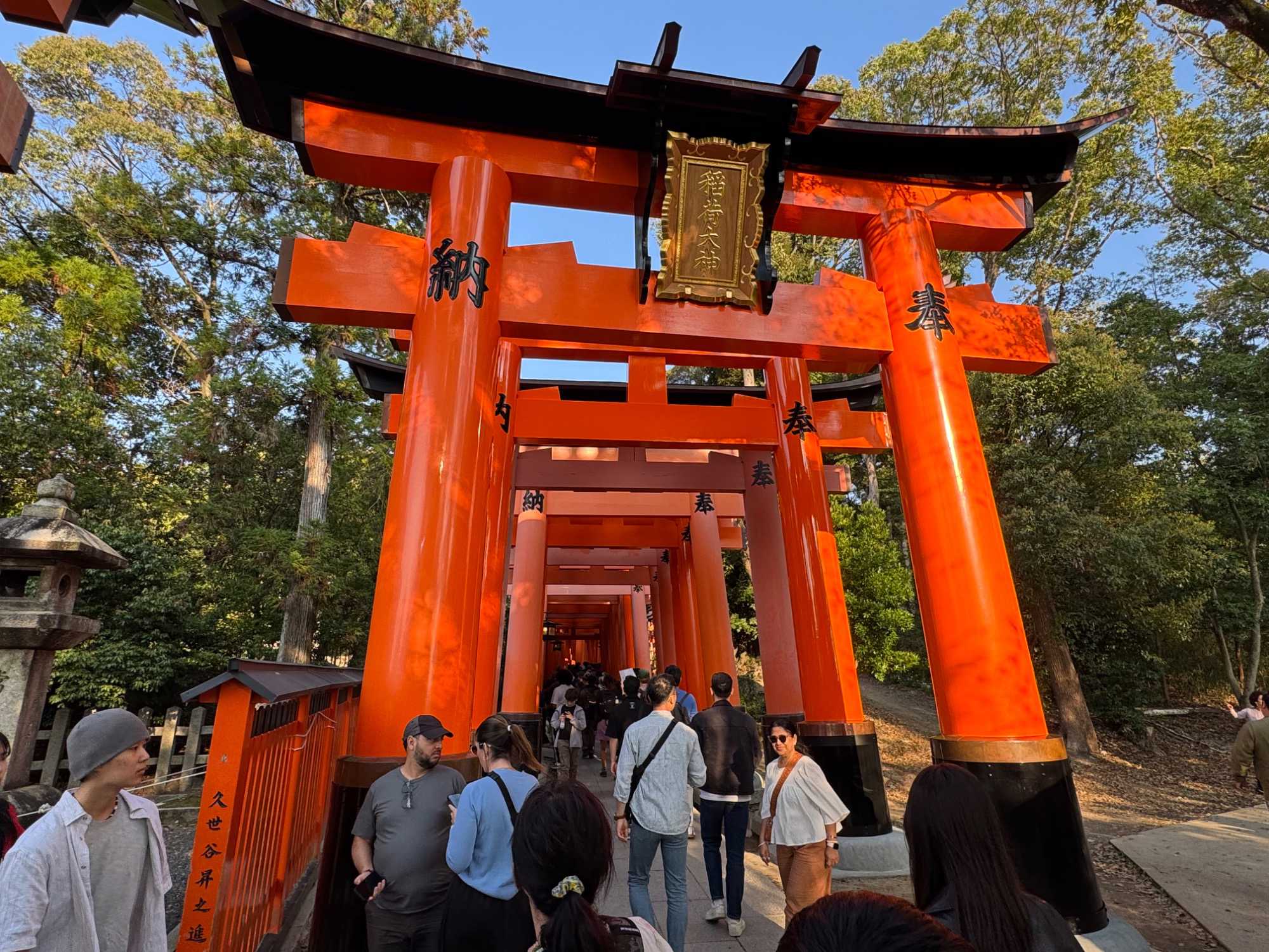 Par la suite, nous embarquons dans notre autobus pour aller visiter le splendide sanctuaire Fushimi Inari-taisha avec ses nombreux Toriis rouges, sortes de portes dans les temples Shintô. Le sanctuaire de Fushimi Inari fait partie des grands sites incontournables de Kyoto. Il est célèbre pour son alignement de près de 10 000 toriis qui grimpent à travers la montagne. Incontournable au Japon, son côté photogénique attire également une foule de touristes. Le dieu Inari a un rôle très important dans la religion shintoïste, ainsi que dans la foi des Japonais. Inari est le dieu du riz, du saké, du thé, de l’agriculture, de la fertilité, des renards et des affaires. Inari est aujourd’hui considéré comme l’un des plus grands protecteurs du peuple japonais. On dit qu’Inari est gentil et très beau. Ils le décrivent avec de longs cheveux noirs, portant un kimono vermillon, il est androgyne. S’il était présenté aux terriens, ceux-ci pourraient même s’évanouir devant tant de lumière ! C’est pourquoi le dieu Inari envoie ses messagers sur terre pour prendre ses nouvelles; les messagers sont les renards blancs, donc dans tous les sanctuaires d’Inari, il y a toujours deux renards qui gardent l’entrée. Dans tout le Japon, il existe environ 32 000 sanctuaires shintoïstes dédiés à ce dieu important. Le sanctuaire est situé au pied du mont Inari et comprend de nombreux sanctuaires mineurs qui s’étendent sur 4 kilomètres. Chacune des 10 000 portes du sanctuaire, les toriis, a été payé par un particulier ou une entreprise japonaise dans l’espoir de recevoir chance et fortune. Le nom du donateur est écrit à l’encre noire au dos de chaque porte. La structure principale du sanctuaire a été construite en 1499 et est désignée comme un bien culturel important du Japon.