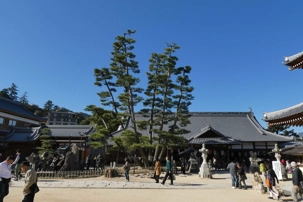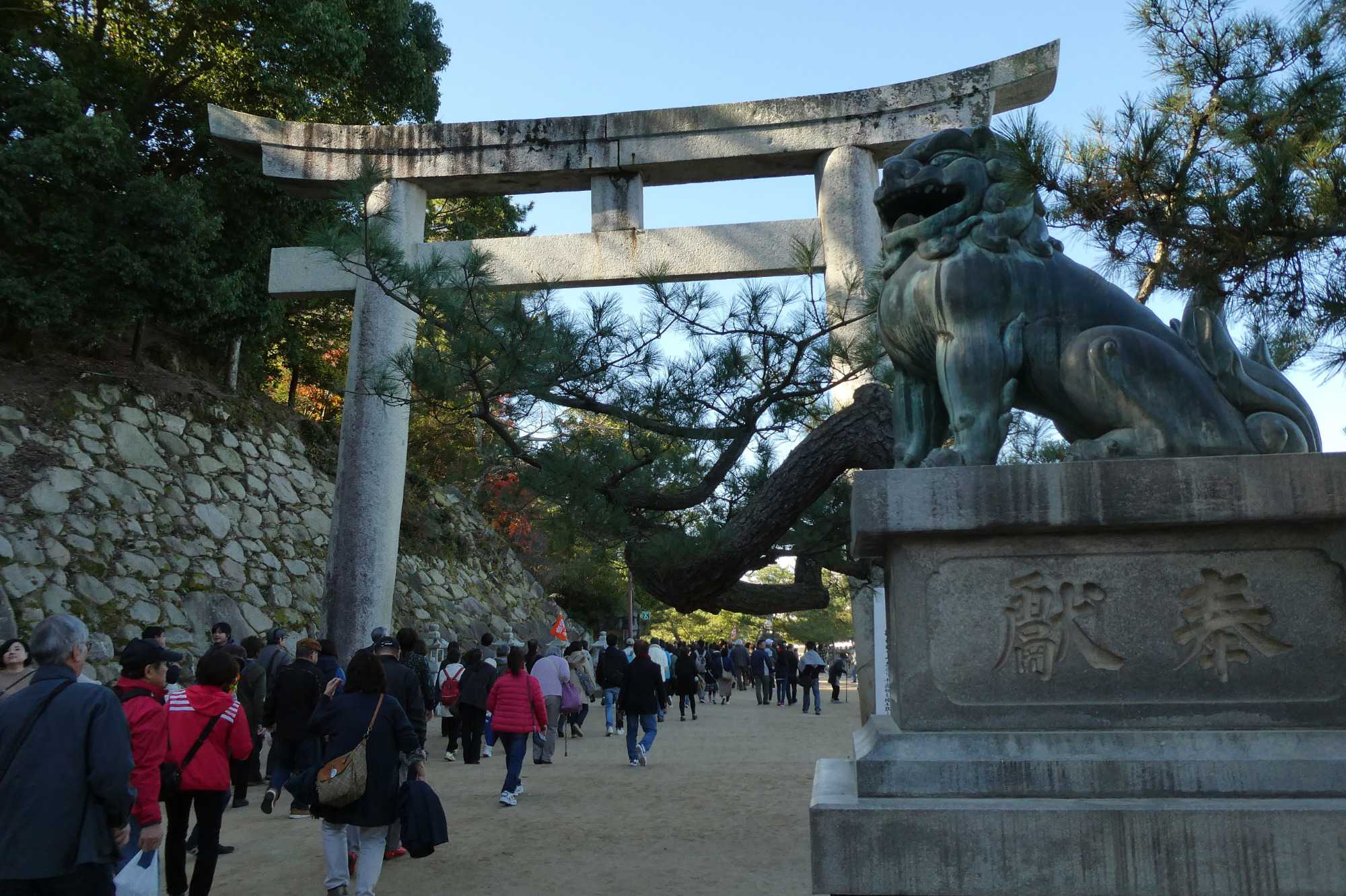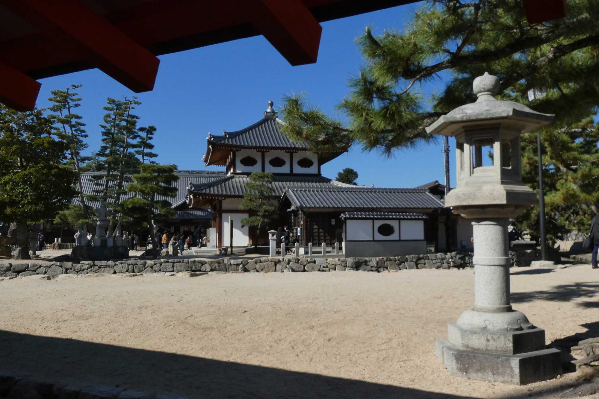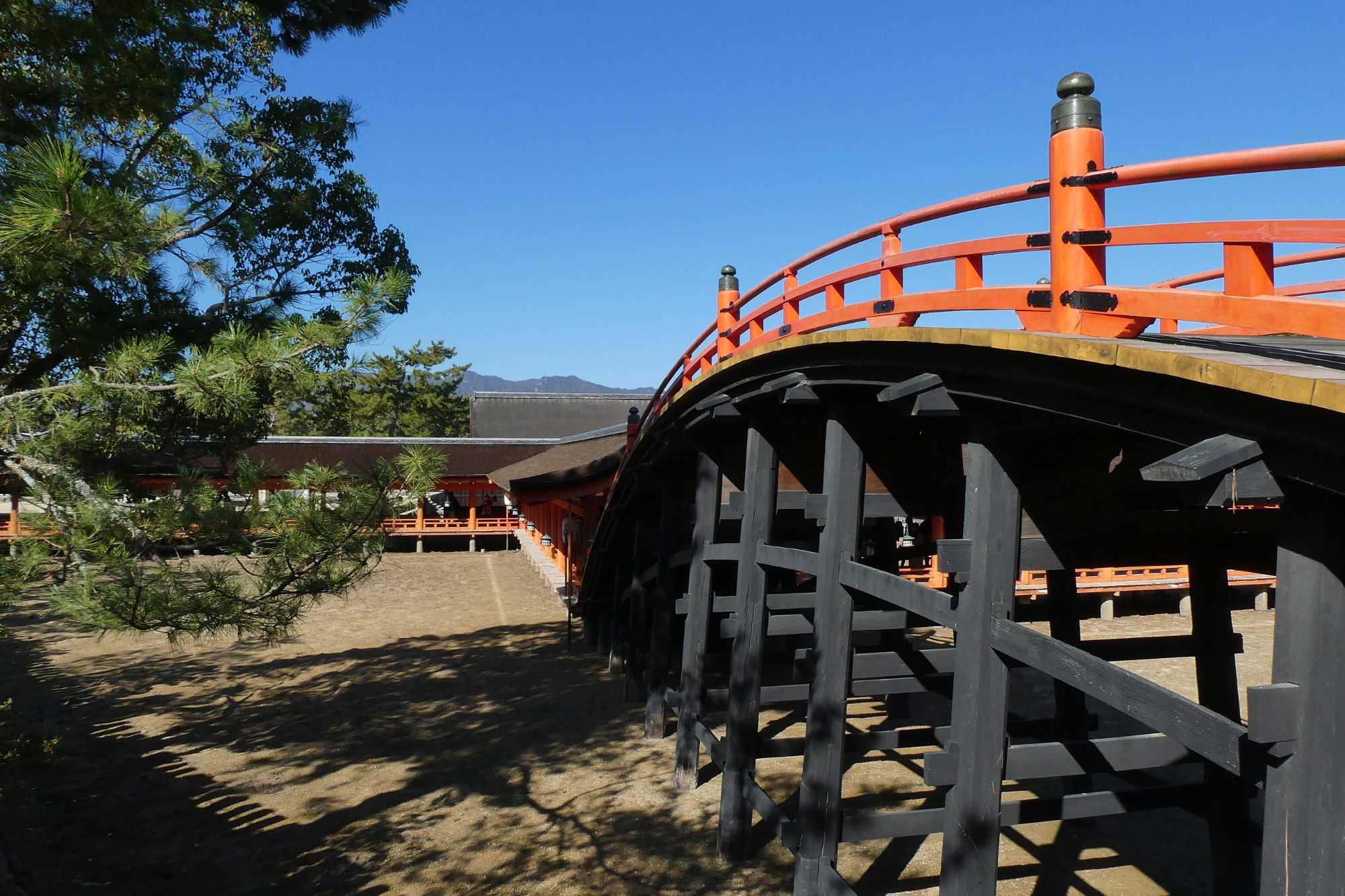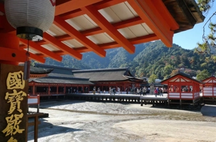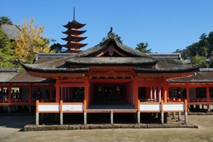 Miyajima, « l'île où cohabitent les hommes et les dieux », surtout reconnaissable par son immense torii vermillon qui semble flotter devant le sanctuaire millénaire d'Itsukushima, dont la première construction date de 593. De plus, cette île où les voitures sont presque inexistantes est couverte d'érables et est habitée entre autres par des daims en liberté considérés comme étant les messagers des dieux. Ce sanctuaire, dédié à la déesse gardienne des mers, a pour particularité d'être en partie construit dans la mer, avec des bâtiments sur pilotis et son torii à quelques dizaines de mètres au large. Les paysages magnifiques de l'île, ses belles plages ou ses sentiers de randonnée en font une destination appréciée en été. Mais, l'automne ou le printemps y ont également de grands charmes, que ce soit avec les érables flamboyants ou avec les cerisiers en fleurs. C'est pour toutes ces beautés que l'île de Miyajima a été classée au patrimoine mondial de l'UNESCO.