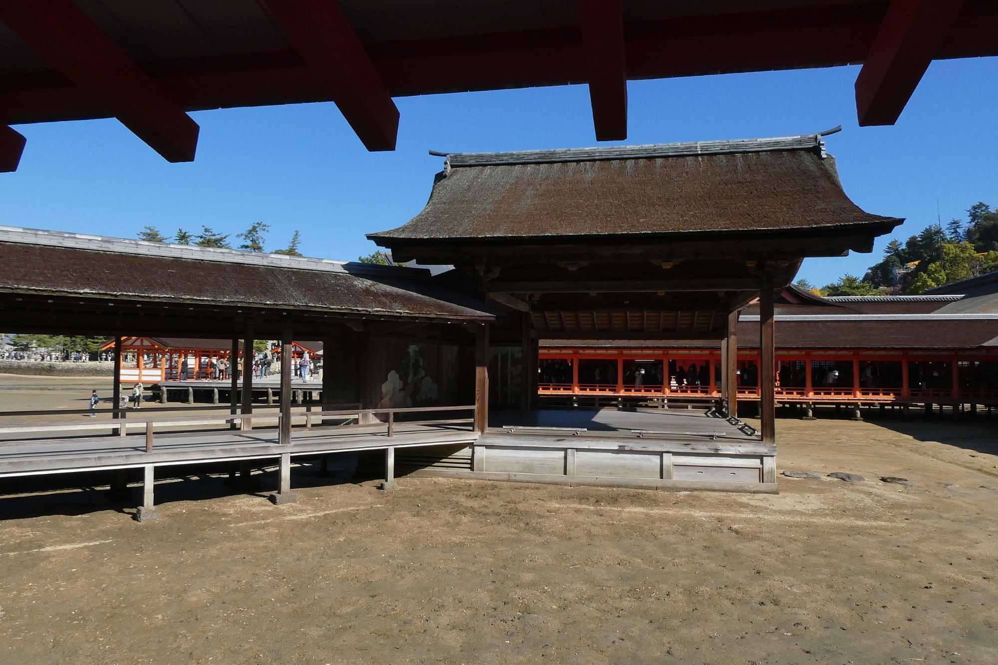 Le grand torii rouge qui repose dans le fond de l’océan devant l’île qui indique la nature sacrée du site est en rénovation ! Une grande toile le recouvre pour que les ouvriers puissent lui faire une beauté. Debout aux intempéries depuis la fin du 19e siècle, il est un peu normal qu’on s’en occupe.