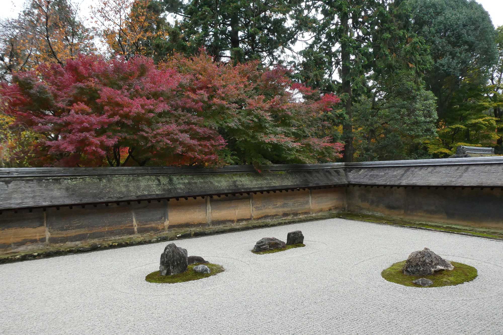 Tous sont ébahis de voir ce petit jardin du 16e siècle, classé UNESCO, parfaitement élaboré autour de 15 pierres dont on ne peut voir que 14 peu importe où on se place sur le balcon de méditation. Cet aménagement, appelé un jardin sec, rappelle aux pratiquants zen qu’il y a toujours une face cachée à tous ce qui nous entourent (incluant les gens), la 4e dimension. Le tout bien encadré par un paysage emprunté d’érables flamboyants. La remarquable mousse cultivée présente un tapis verdoyant.