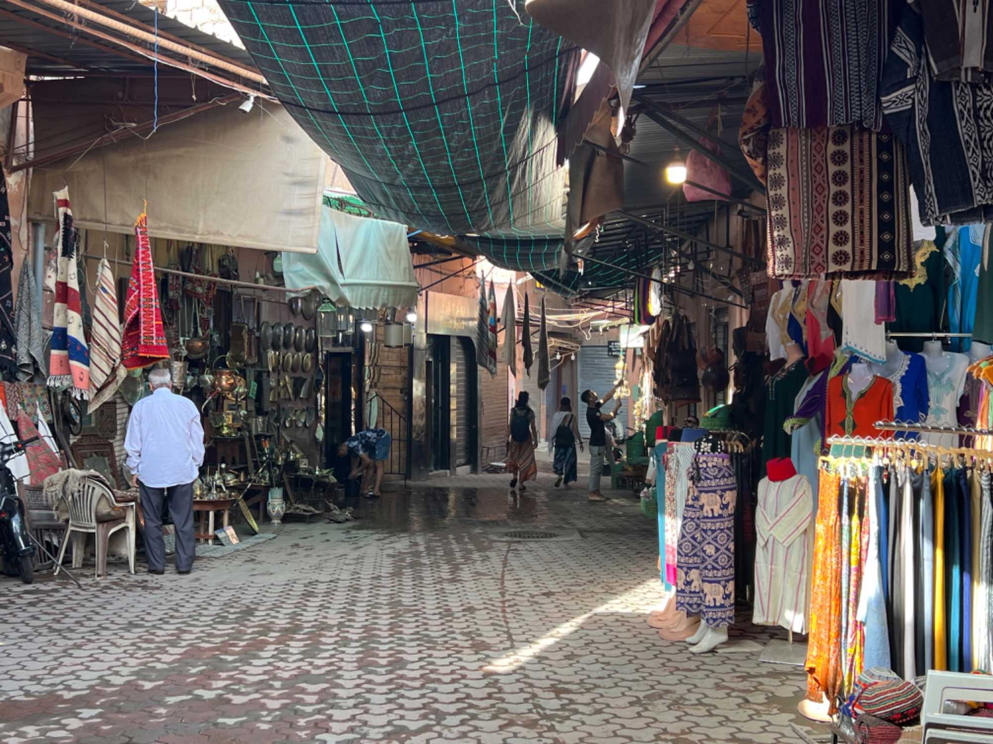 Nous visitons la médina de Marrakech et des souks, une étape indispensable lors d’un passage à Marrakech. On y retrouve un mélange magnifique d’odeurs et de saveurs. Nous commençons notre visite par les rues des ateliers dans les souks. Malheureusement il n'y a presque rien d'ouvert car c'est la journée de la grande prière alors plusieurs personnes sont en congé.