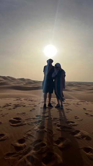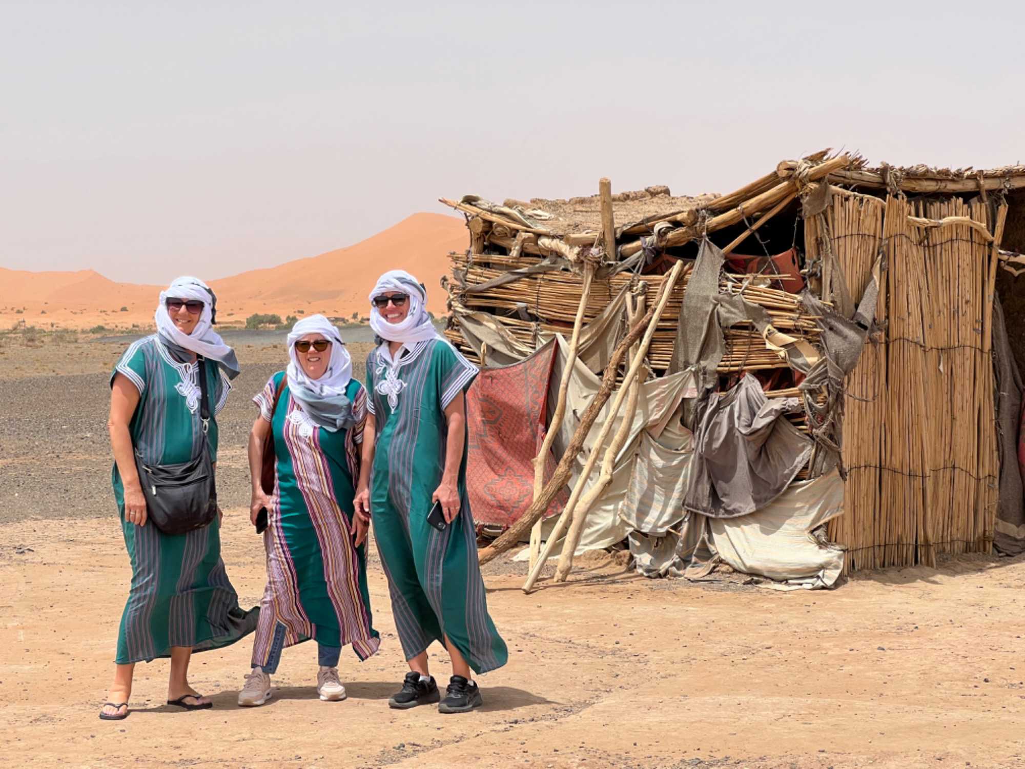 Petit arrêt pour voir les premières dunes de sables et, surprise, les filles ont des robes marocaines et des chèches (foulard touareg), elles sont très contentes et les gars portent des chèches également, nos chauffeurs nous installent tout ça.