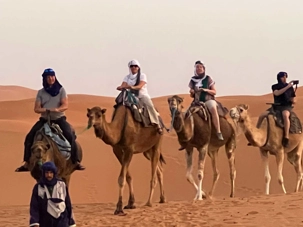 Comme il fait très chaud on profite un peu de la piscine, pour nous rafraîchir, et nous continuons notre chemin pour arriver à nos bivouacs où nous sommes attendus pour voir le coucher de soleil à dos de dromadaire. Tous ont apprécié cette expérience, ouf! Que du bonheur.