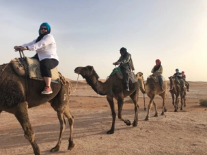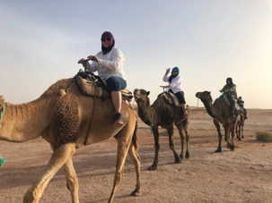 On relaxe un peu et les chameliers nous attendent pour la promenade. C’est le coup de cœur de tous! En dromadaire, nous allons à la plus haute dune pour le coucher de soleil mais dû au vent, c’est difficile. Il y a des nuages devant mais c’est pas grave car c’est agréable et c'est la balade qui nous importe.