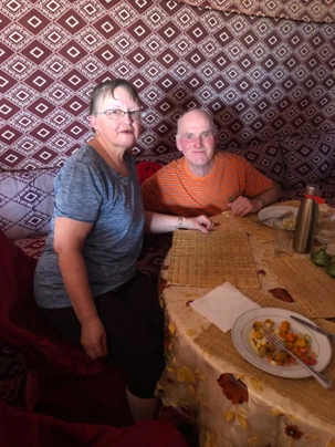 On soupe au désert. C'est très agréable et on y mange encore très bien! Il y a une tradition qui veut qu'après le souper, nos guides et nos hôtes chantent et dansent avec nous. Soyez certains qu'on en a eu du plaisir!