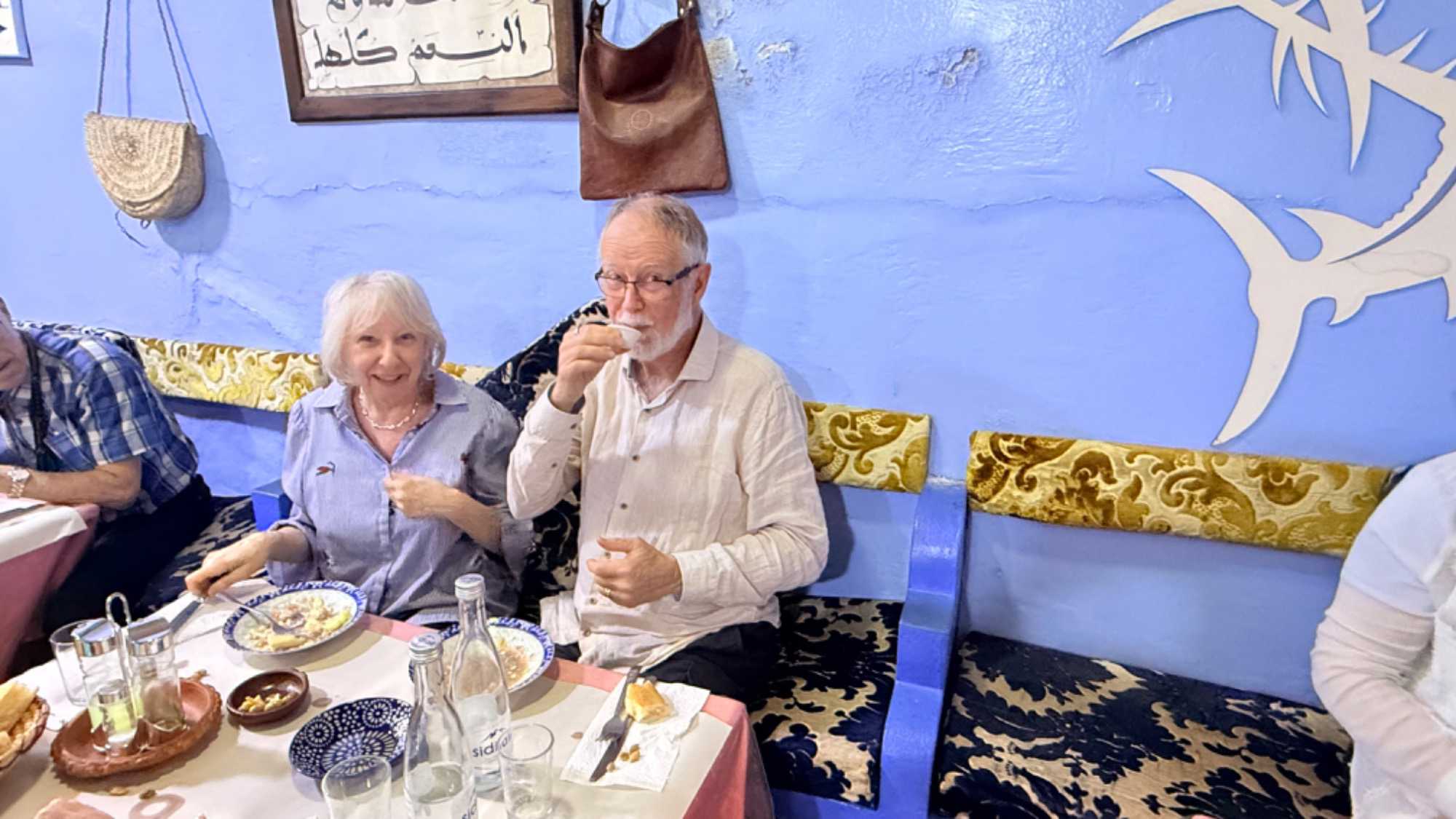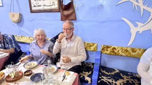 Nous le suivons ensuite à son atelier de cuisine après avoir fait nos courses sous ses conseils. Ah! Apprendre à tâter une aubergine, renifler un poivron et soupeser une tomate est tout un art! Partis de rien, nous avons choisi les légumes, les épices, les fruits et la viande, soit tout ce qu’il faut pour faire un tajine d’agneau accompagné de pommes de terre, carottes et courgettes, etc., et comme dessert, nous faisons une salade de fruits de saison et une belle assiette de melons et d’oranges à la cannelle.