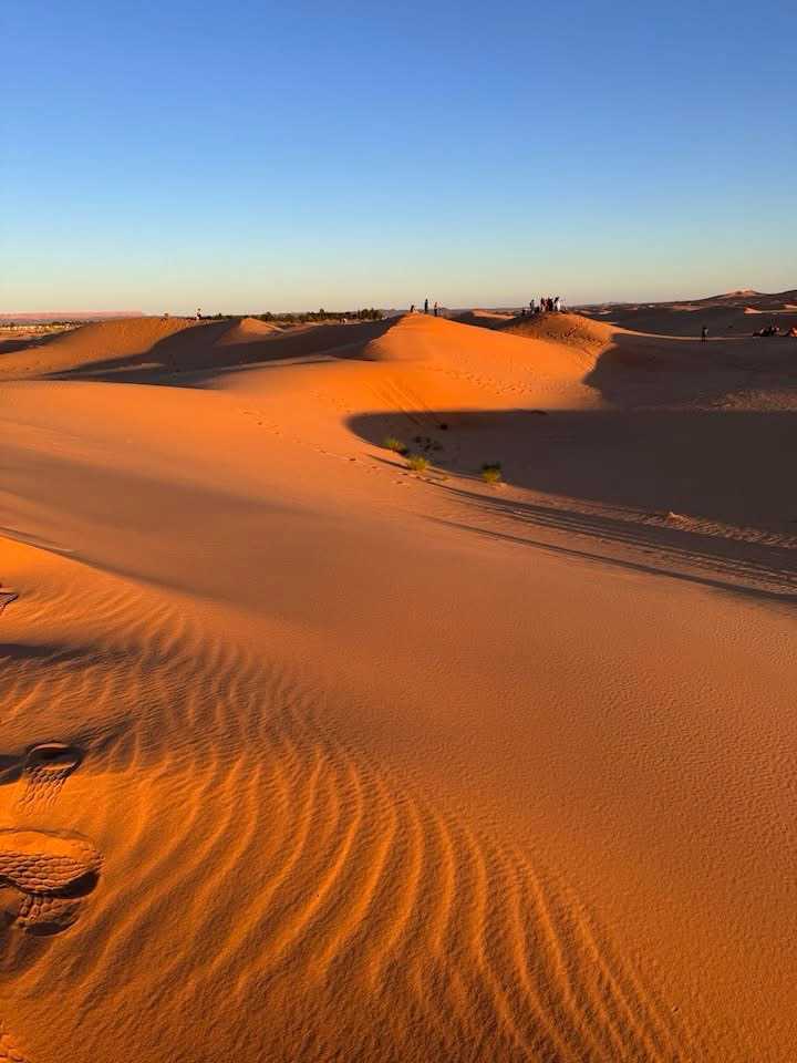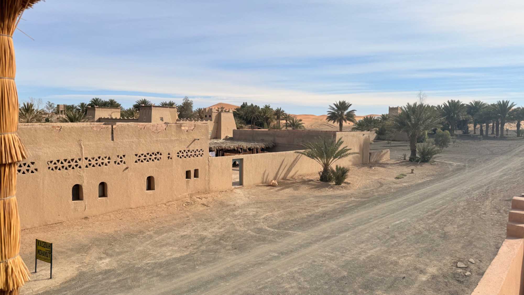 Néanmoins, c’est aujourd’hui le point culminant de notre beau voyage : le désert! Le désert en dessert! Nous l’attendions avec impatience. Nous sommes donc à Merzouga, cette petite ville marocaine située dans le désert du Sahara, près de la frontière algérienne, qui s’ouvre sur l’erg Chebbi, une immense étendue de dunes de sable au nord de la ville.