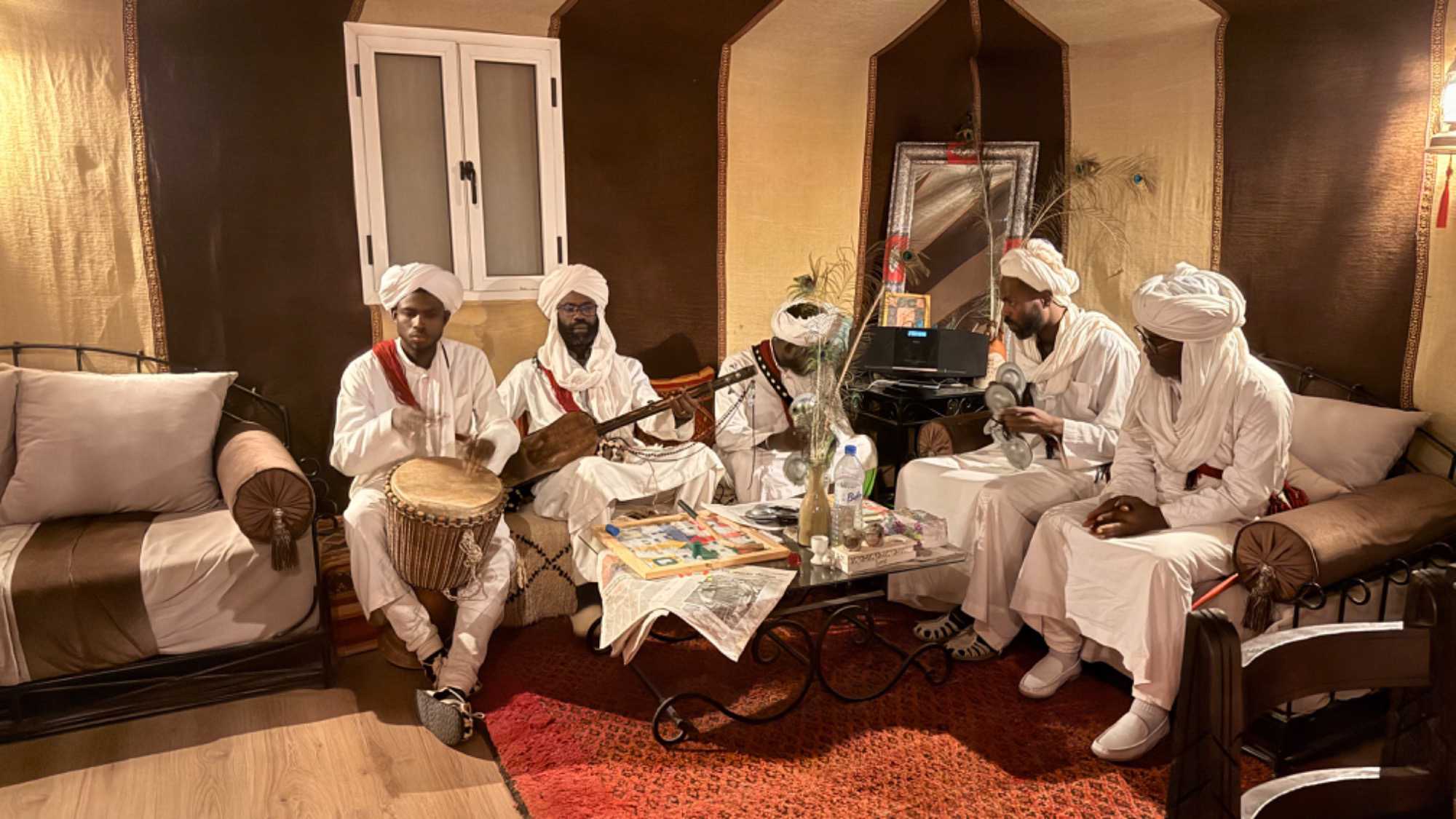 Nos chauffeurs l’ont sans doute compris ou deviné, on s’arrête. Et là, une surprise de taille attend tout mon monde, hommes et femmes, une surprise comme seul Voyage Louise Drouin peut en faire en offrant aux femmes des robes marocaines Gandoura et des chesters (foulard touareg) également offerts aux hommes. Nous voilà habillés de circonstance avec l’aide des chauffeurs. Ainsi vêtus et fiers de nos apparences, on prend bien sûr des photos souvenirs.