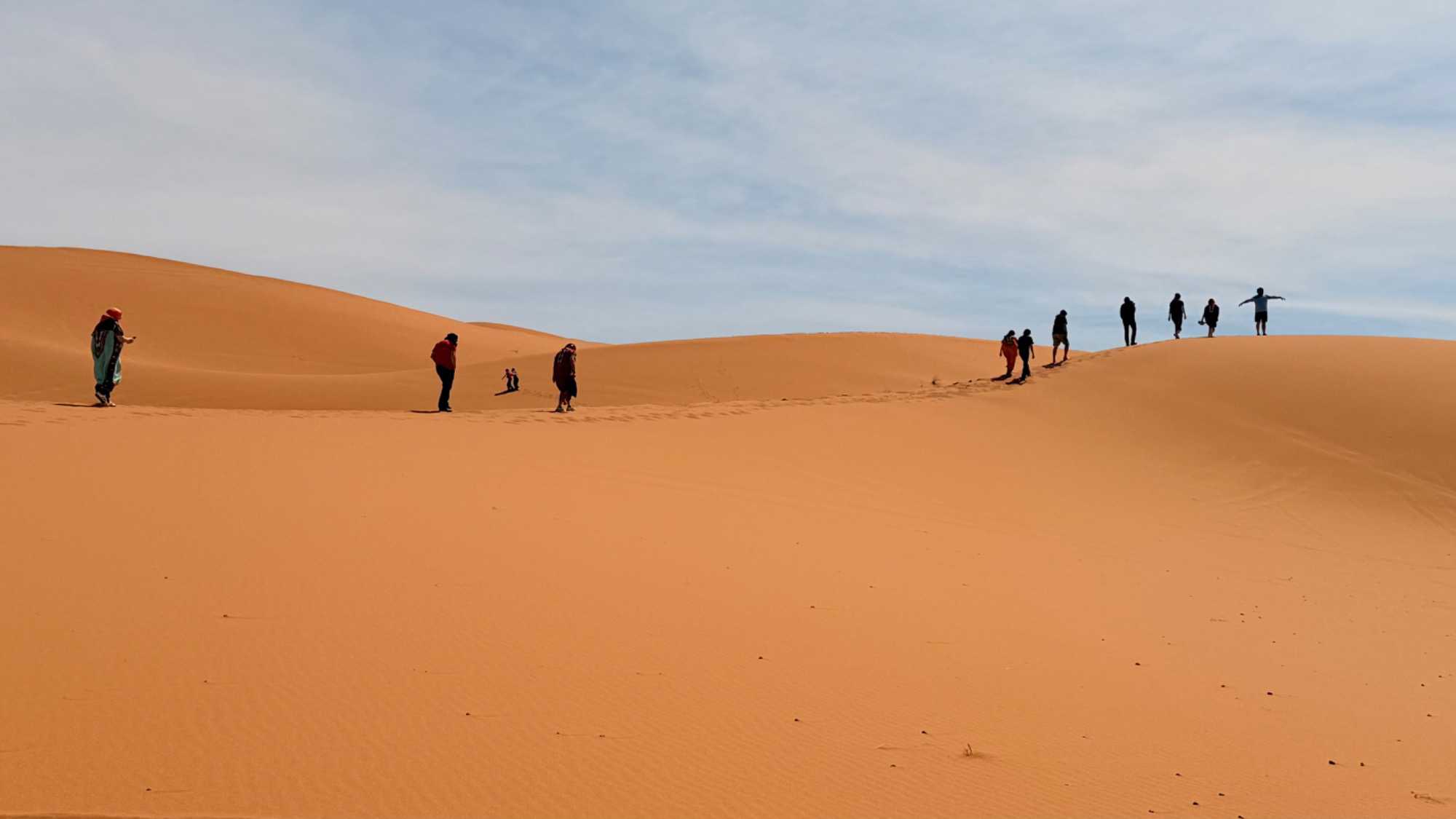 Nous profitons de ce temps d’arrêt pour un premier contact avec les dunes de sable, pour que chaque personne s’imprègne du lieu et de l’atmosphère. Pour certains, juste marcher sur la dune comble leurs attentes; d’autres profitent du moment pour s’asseoir et se laisser caresser par le vent et le soleil; quelques-uns, curieux, posent des questions et s’informent du genre de vie que l’on a sous pareilles latitudes. C’est ce qu’on appelle des moments bénis qui ont un gout d’infini.