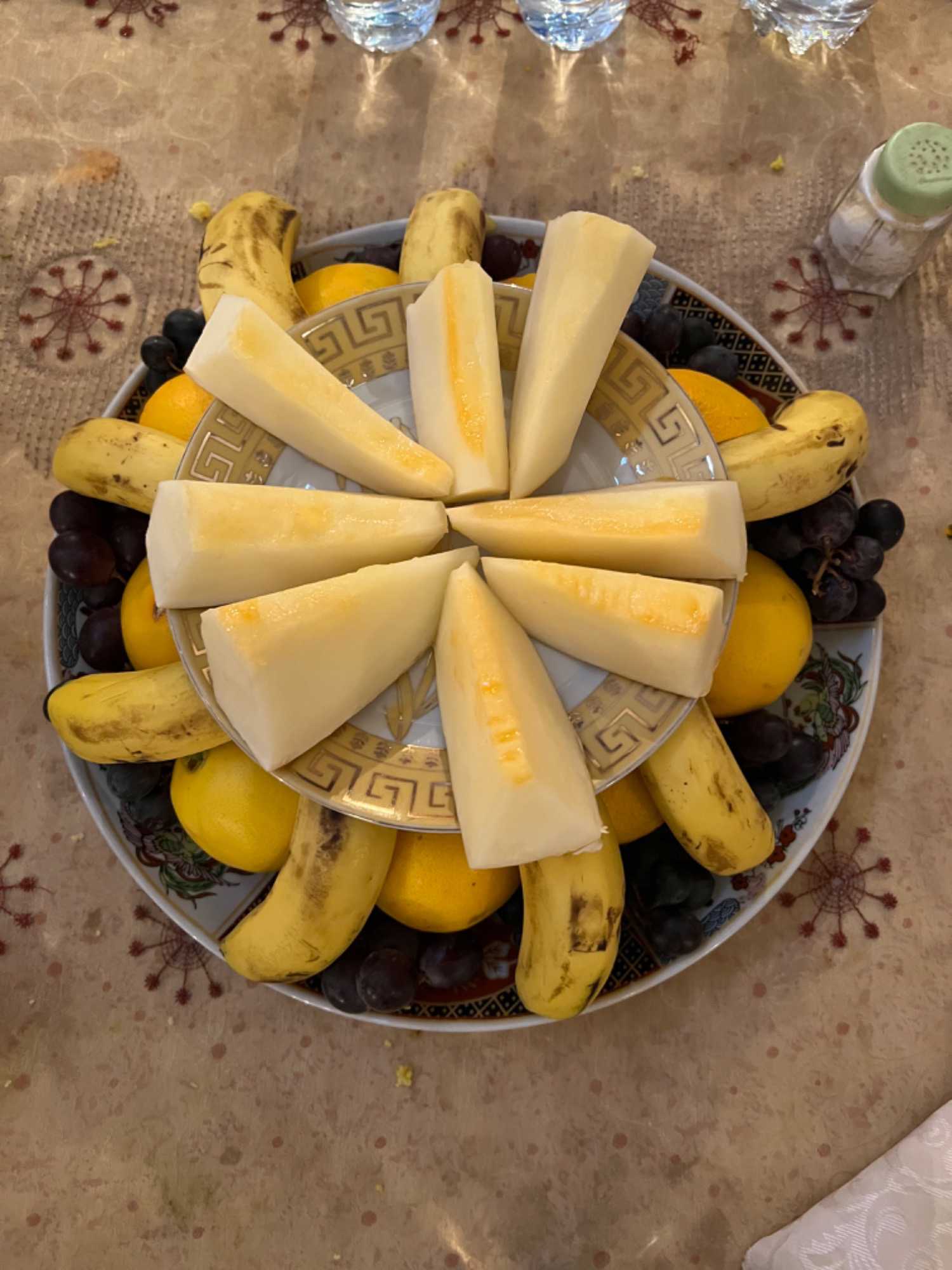 Nous nous arrêtons pour dîner dans un restaurant typiquement marocain où on nous sert une salade marocaine, un tajine de poulet légumes et olives et des fruits, c’est très bon!
