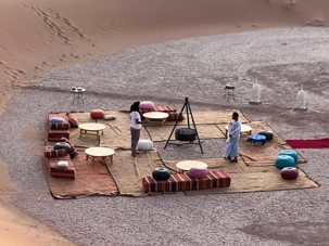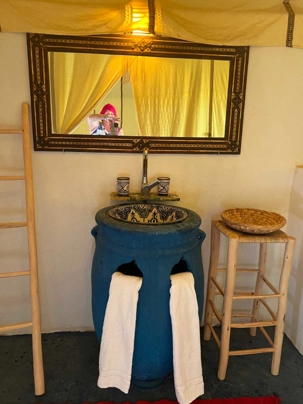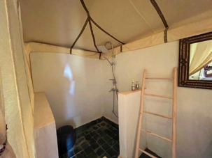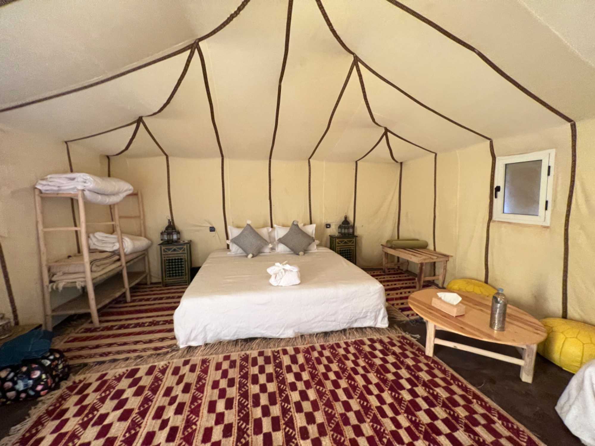 Dès notre arrivé Mohammed nous fais visiter notre petit coin, j’attribue les bivouacs et chacun est surpris de voir la qualité car nous avons tout ce qu’il nous faut : lit, toilette et douche. On est bien installés.