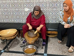 Une dernière visite d'une coopérative féminine pour tout apprendre sur la chaîne des valeurs de l'argan. Outre l'huile, connue pour ses bienfaits alimentaires et cosmétiques, les voyageurs ont trouvé tout le plaisir à goûter à de l’amlou (préparation culinaire berbère qui se compose d’huile d’argan, d’amandes ou de cacahuètes et peut contenir du miel) et au miel pur.