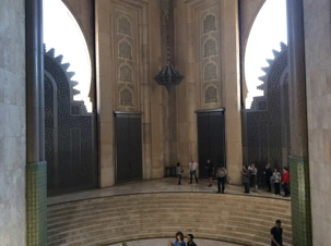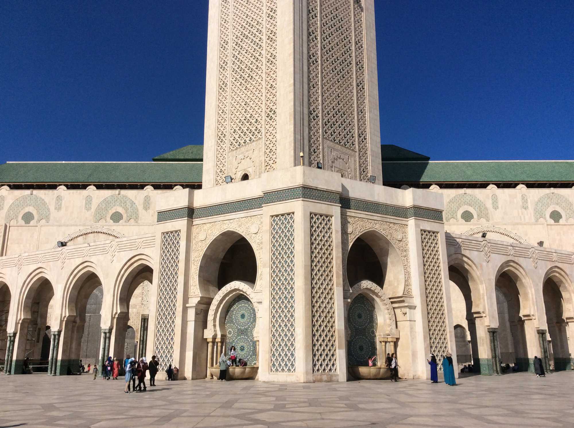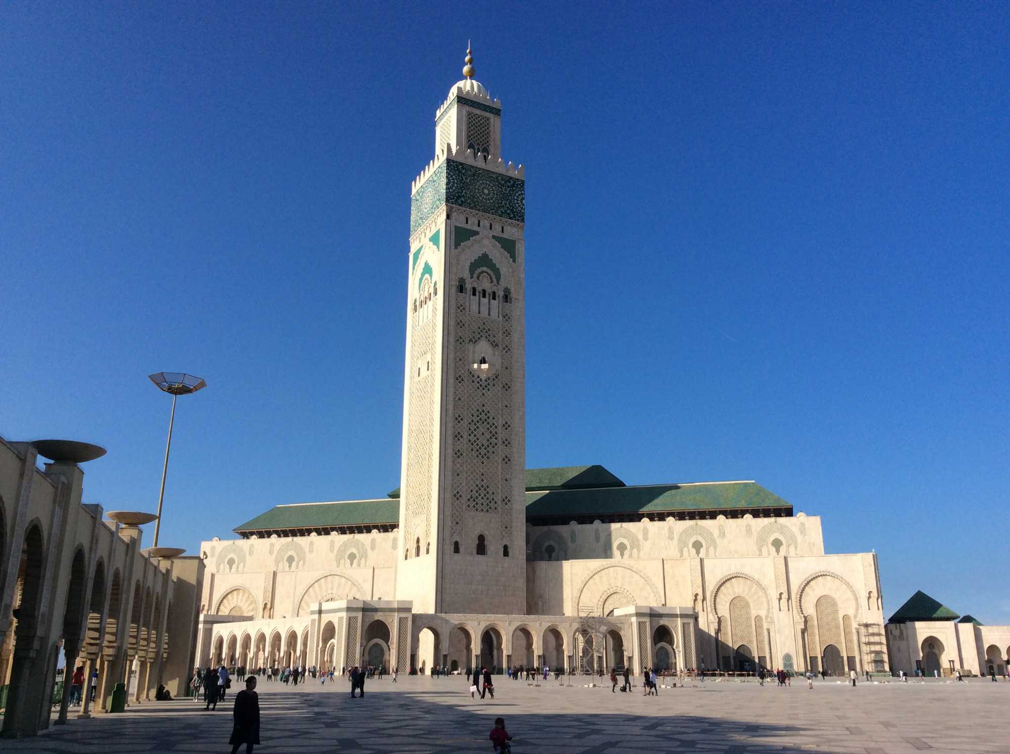 C'est la troisième plus grande mosquée au monde après celles de de la Mecque et de Médine. Construite en seulement 6 ans de travail, mais 24h sur 24h. Inauguré en 1993, au coût de presque un milliard de $. En référence au verset : Le trône de Dieu est sur l'eau! Elle a été construite en partie sur l'océan atlantique. De dimension de 200m par 100m avec le minaret le plus haut au monde, elle peut contenir plus de 25 000 fideles à l'intérieur et 80 000 sur l'esplanade extérieure, pour un total de 105 000 fideles. Pour vous dire, la porte principale est fait en titane afin d'éviter la corrosion dû à la proximité de l'eau salée de la mer et pèse plus de 34 tonnes. Tous les plafonds sont faits de bois de cèdres sculptés et peints avec des feuilles d'or. Il n'y a pas d'autres mots que : Impressionnant!