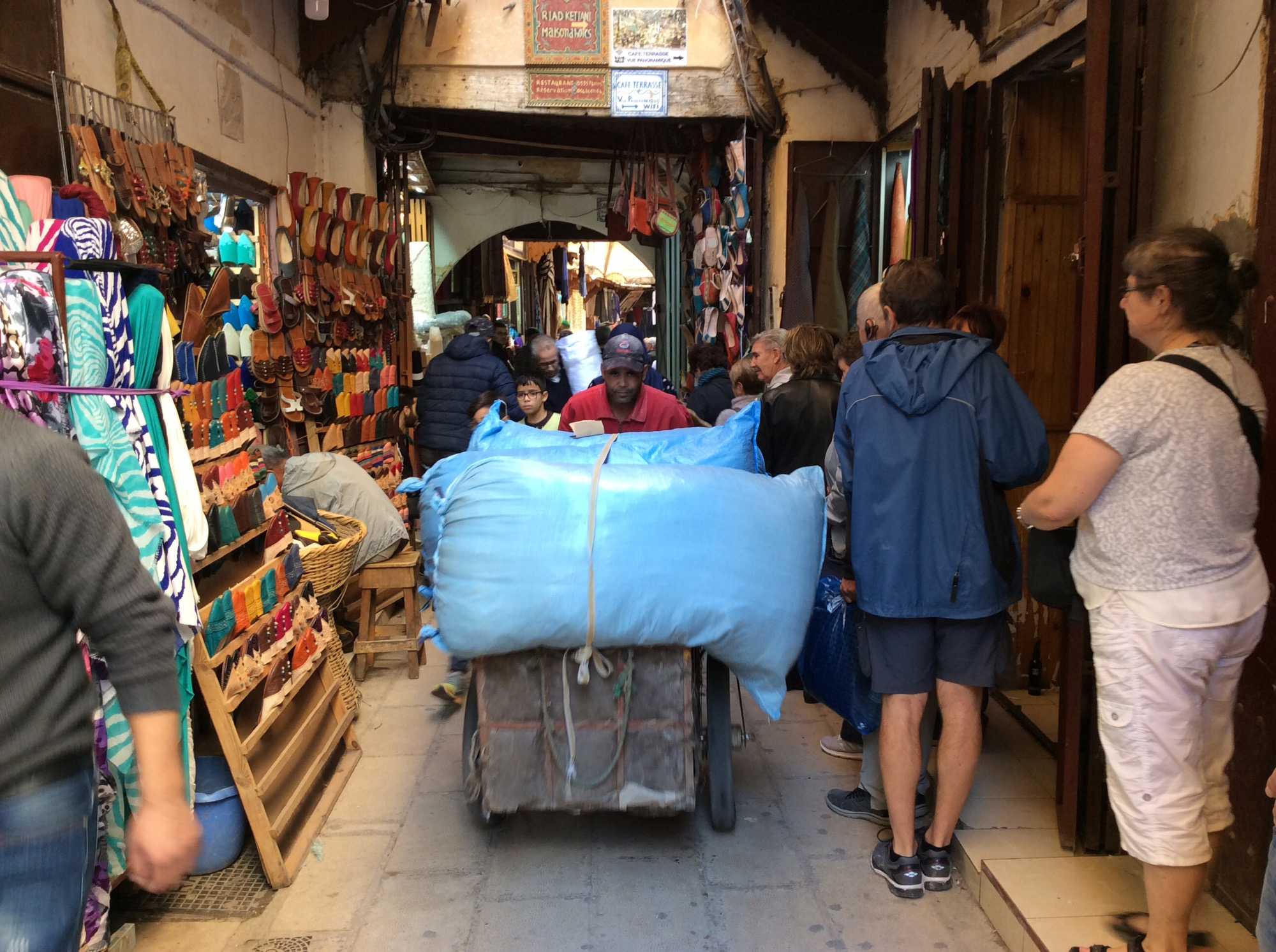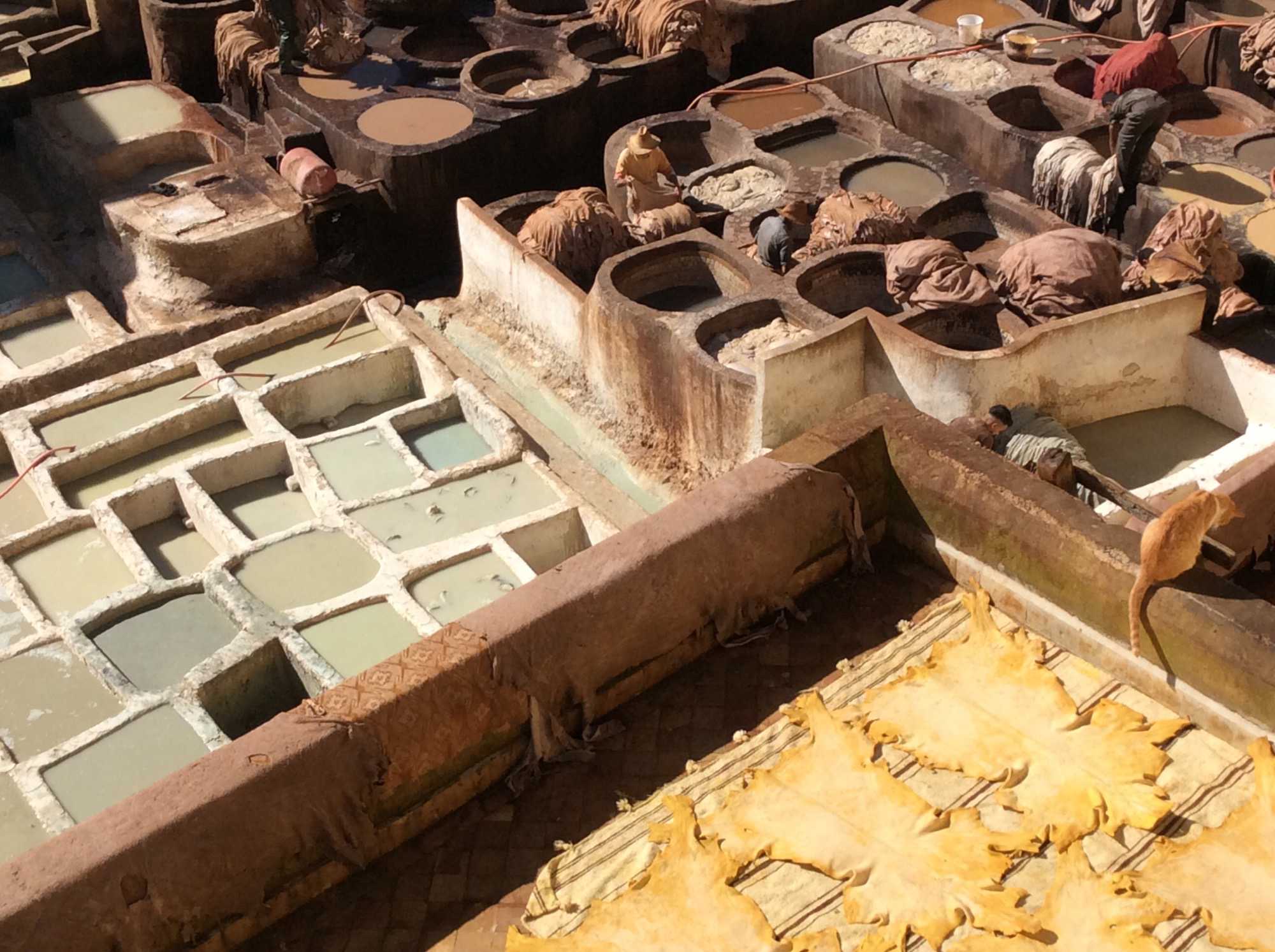 N'oublions pas l'un des lieux les plus emblématique de la ville; le quartier des tanneurs, qui d'ailleurs n'a pas changé depuis l'époque médiévale. C'est une réelle immersion dans le cœur même de l'artisanat: des peaux de différents animaux, acheminé à dos d'ânes, pour etre lavées dans la rivière, puis la faisant passer par différentes procédure entre le choc chimique à base de chaux, puis des colorants naturels... On observe toutes les étapes de la préparation des peaux, reliée aux techniques les plus élémentaires. Ça donne lieu à des scènes pittoresques des plus inattendues. C'est tout un spectacle! C'est vraiment à voir! Il va se soi que l'odeur est un peu...désagréable...ce qui explique le petit cadeau qu'ils nous offrent : une tige de menthe...ça change l'odeur! Plusieurs l'ont de collée sur le nez!
