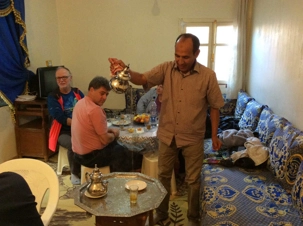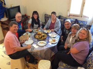 À Midelt, l'heure du dîner a sonné et, grâce à nos guides, nous partageons le repas chez l'habitant, dans la famille de l'un de nos guides. Poulets rôtis servis avec pommes de terre et légumes, avec une excellente soupe en entrée! Quelques photos avec la cuisinière! Grande différence d'avec chez nous : elle a le droit de se faire photographier seulement si elle obtient l'approbation d'un homme de la famille... Sur la photo, en sa compagnie, pas le droit d'homme; uniquement des femmes!