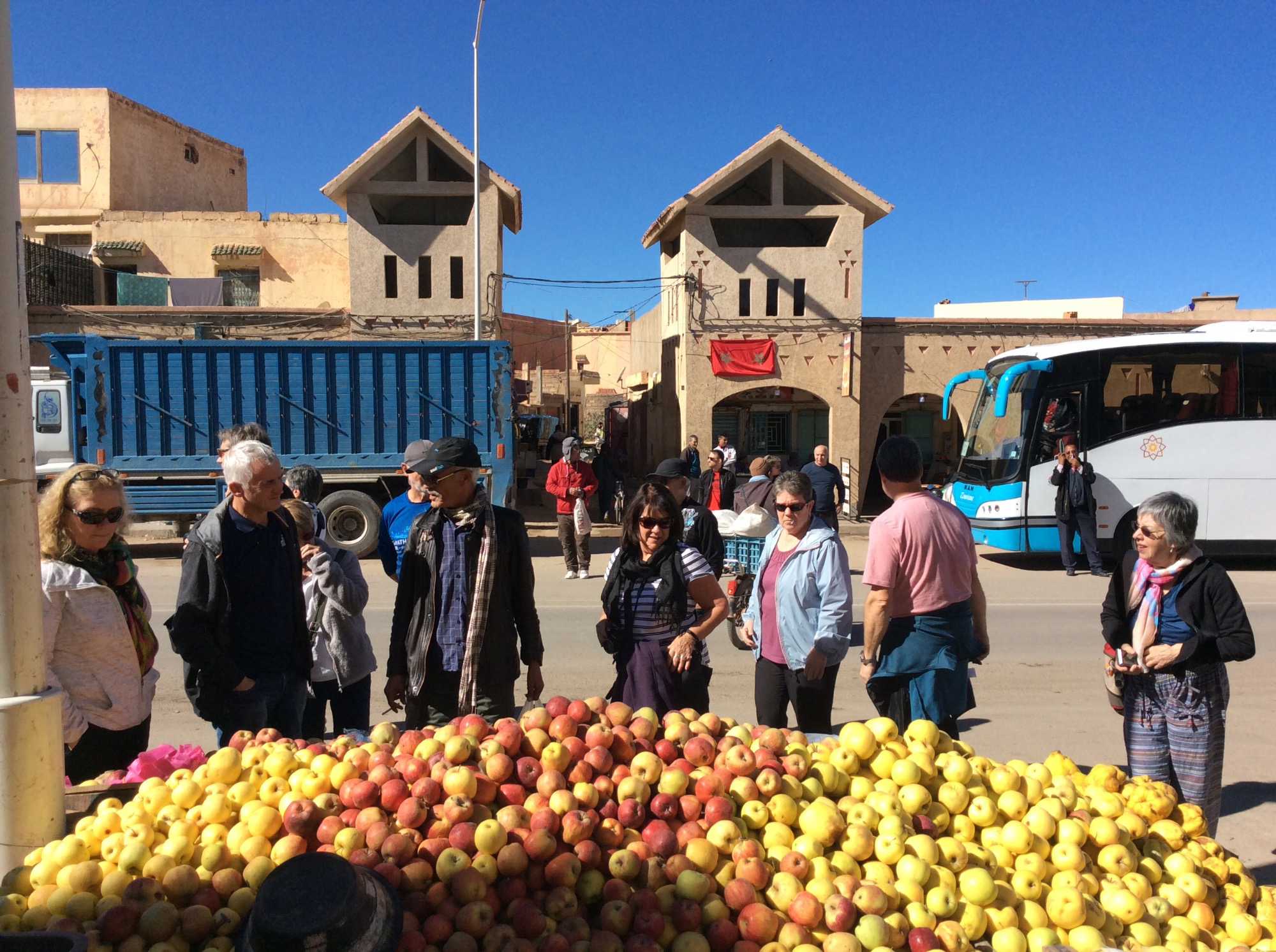 Nous traversons le moyen Atlas pour se rendre de l'autre côté de la chaîne de montagnes. Arrivée à Erfoud, qui se distingue par son architecture présaharienne : des petites maisons cubiques, en pisé rouge et argenté. Erfoud est entouré d’une palmeraie, qui est la principale source de revenus de la région, perdue au beau milieu du désert,