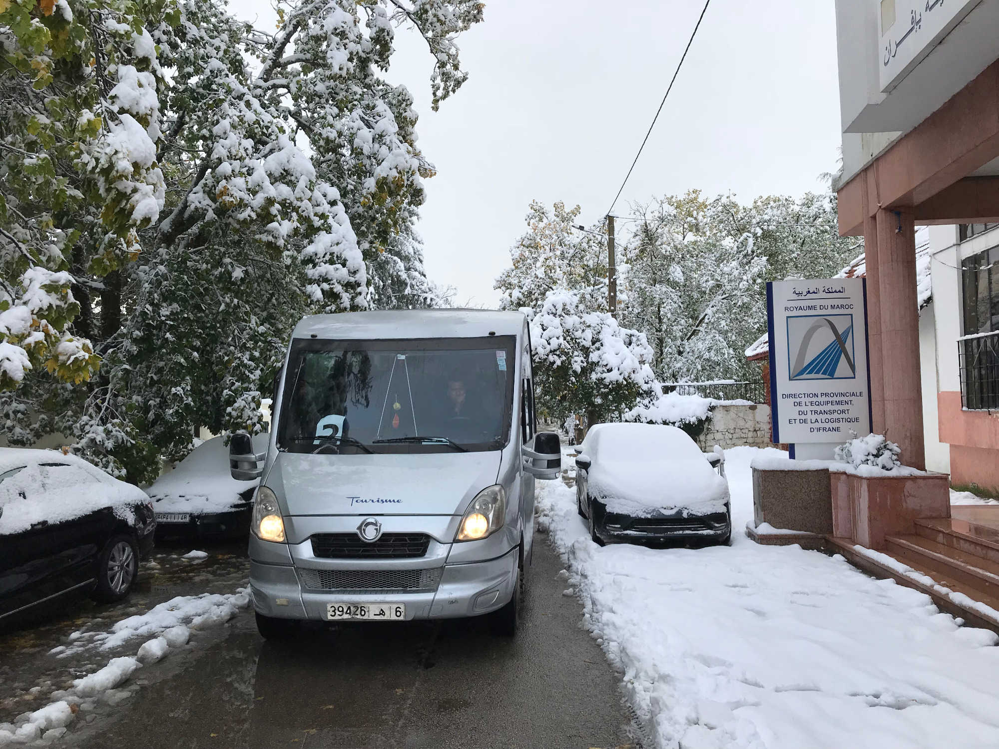 Ce matin, une mauvaise surprise nous attendait. Dès que nous sommes arrivés au début des moyens Atlas, il neigeait à plein ciel. Encore une fois, on nous dit qu’il y a très longtemps qu’ils n’ont pas vu de neige ici.