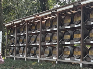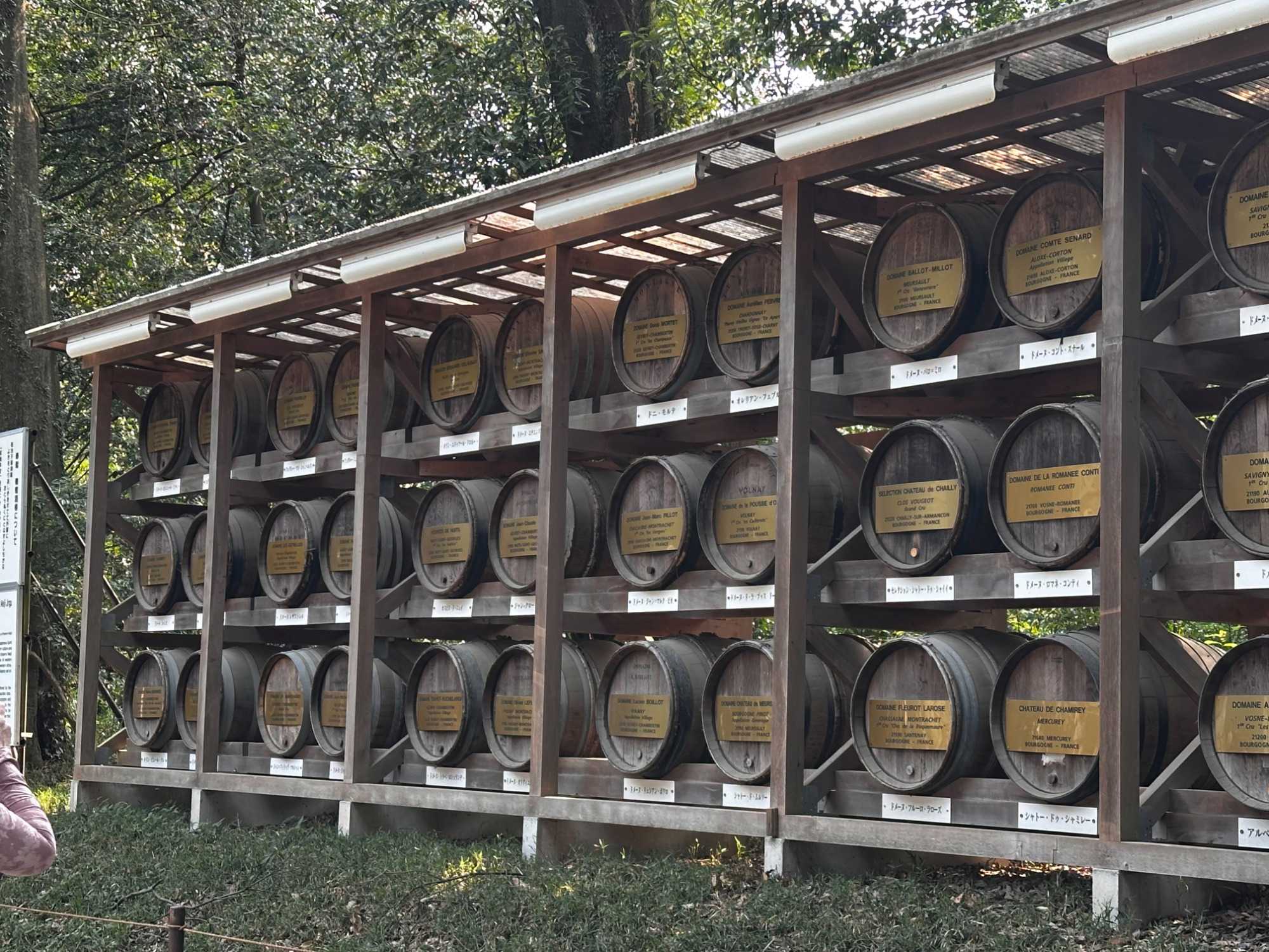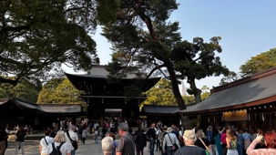 C’est avec la panse bien remplie que nous quittons pour visiter le sanctuaire Meiji-jingū. Cette marche à travers les 350 espèces de végétaux plantés en plein cœur de Tokyo nous redonnent l’oxygène dont nous avions besoin. Un écrin de verdure en plein cœur de la ville. Le sanctuaire Meiji-jingū, dédié à l’empereur Meiji et à l’impératrice Shoken, est un havre de paix où l’histoire et la spiritualité se côtoient. Construit en 1920, ce sanctuaire shinto rend hommage à l’empereur Meiji (1852-1912), celui qui mena le Japon vers la modernité après des siècles d’isolement. Il fut le grand artisan de l’ère Meiji, une période de transformations majeures où le pays troqua son armure de féodalité pour embrasser l’industrialisation et s’ouvrir au monde. Ici, tout invite à la contemplation : l’immense torii en bois de cyprès de plus de 12 mètres sous lequel nous nous sommes inclinés avec respect selon les bons enseignements de Jean, les sentiers bordés d’arbres centenaires où nous devons marcher sur le côté par respect des dieux qui eux, utilisent le centre de l’allée. Les offrandes des fûts de saké colorés offerts par des brasseries de tout le Japon de même que des barils vides de vins de grands crûs garnissent l’allée menant au temple.