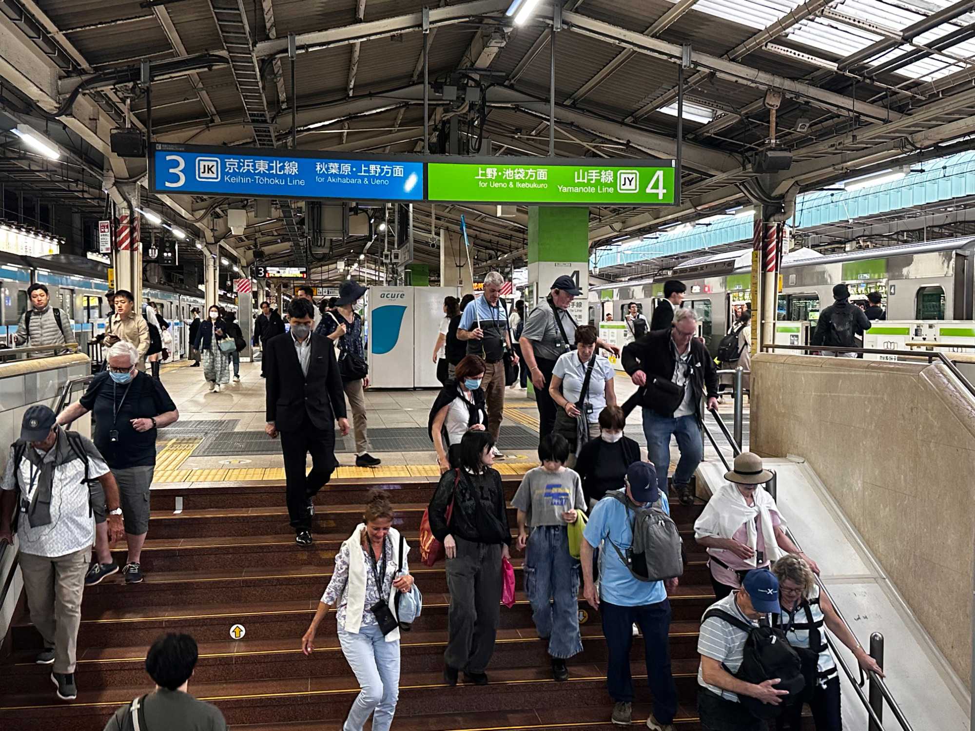 Pour rentrer à l’hôtel, quoi de mieux que d'emprunter les transports en commun comme les vrais tokyoïtes. Rien de moins que la gare de Shinjuku, la plus fréquentée du monde, avec plus de 3,5 millions de passagers quotidiens. Jean, nous prévient : « Ne vous éloignez pas du groupe, ou vous risquez de finir à Kyoto! » «et l'on garde la gauche s.v.p. ». Je sens un peu de nervosité dans le groupe ! Nous avons réussi et ça mériterait presque un diplôme.