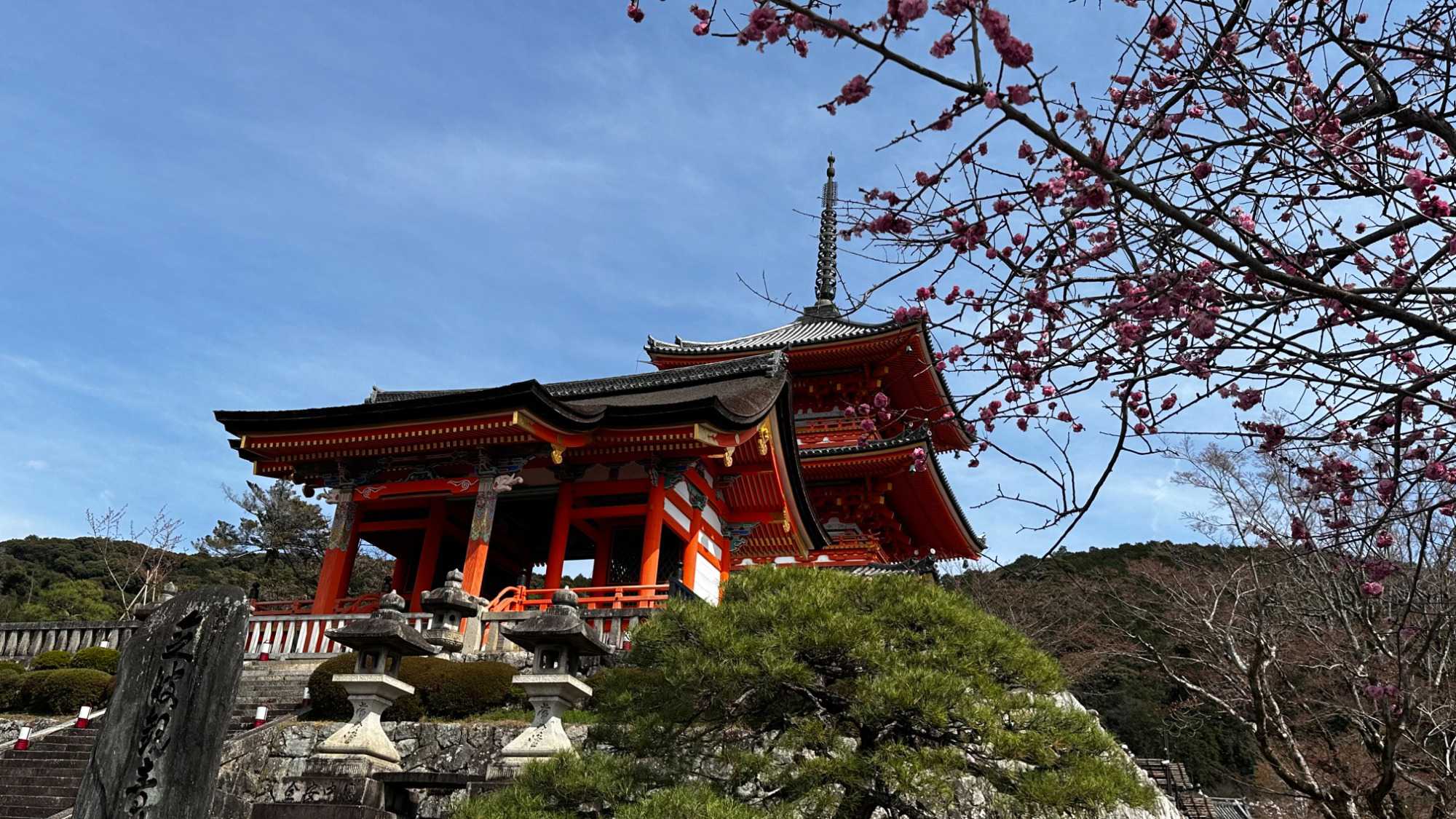 À l’arrivée, nous sommes accueillis par la majestueuse porte Deva, rouge éclatant comme si elle avait été fraîchement repeinte pour nos beaux yeux. Passée la porte de l’ouest, nous découvrons une belle pagode à trois étages. Mais le clou du spectacle, c’est le pavillon principal (Hondo), juché sur ses pilotis de 15 mètres de haut. La vue est à couper le souffle. De là, Kyoto se dévoile sous son plus beau jour, entourée de verdure et de montages, un véritable enchantement, particulièrement lors de la floraison des cerisiers.