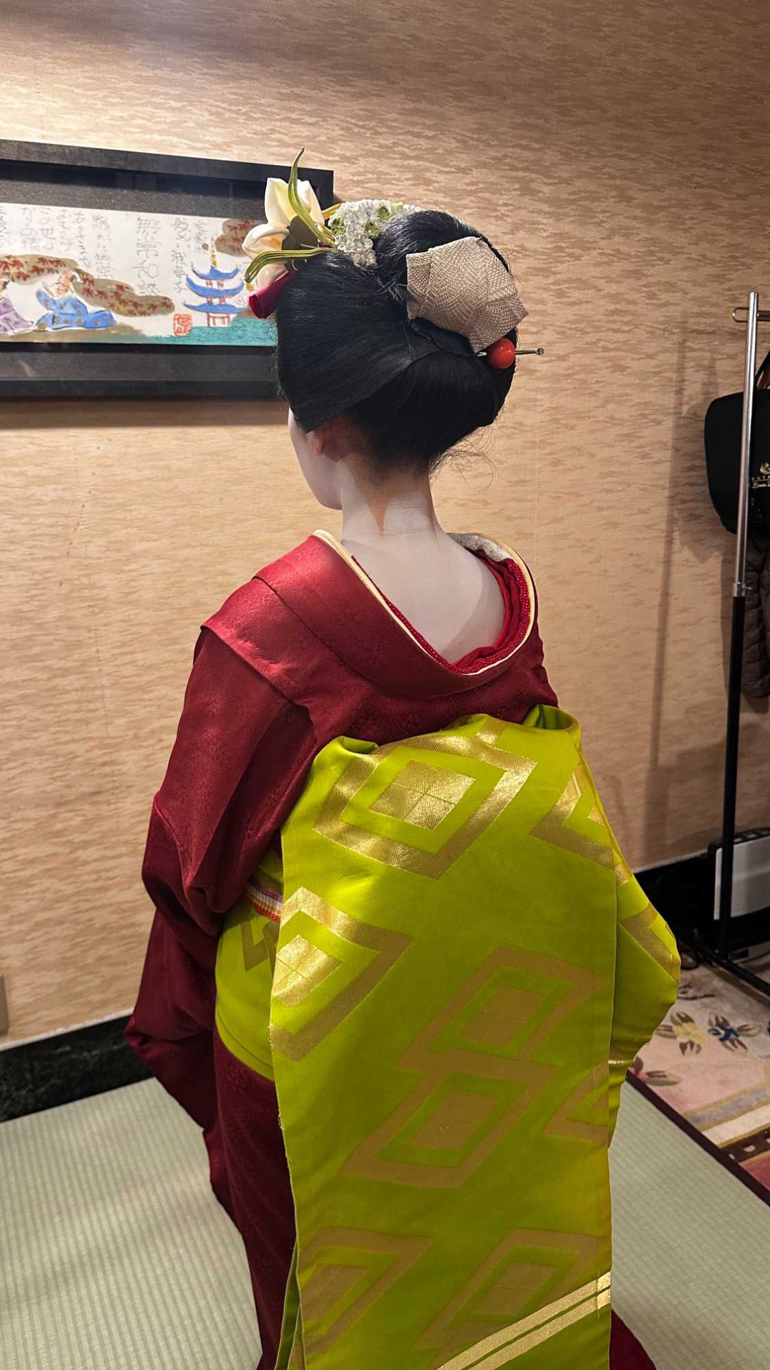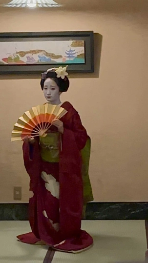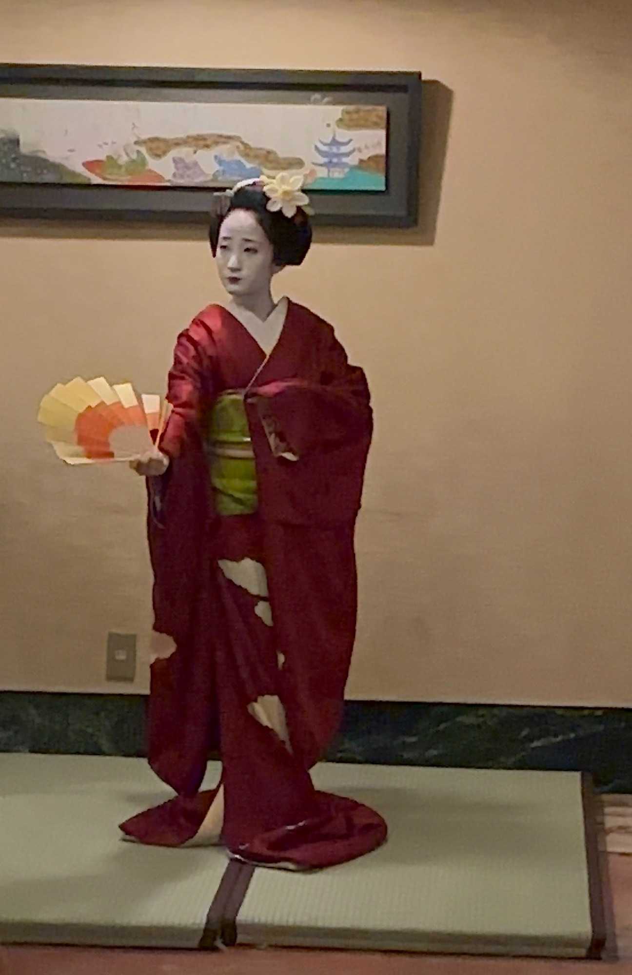 Car pour clore cette belle journée, nous dînons au restaurant Ganko Takasegawa Nijoen, où nous goûtons à la cuisine kaiseki, un “privilège” de la gastronomie japonaise. Une succession de petits plats délicats présentés dans une esthétique raffinée à souhait. C’est vraiment très bien présenté, bien que nous n’ayons aucune idée de ce à quoi s’attendre comme mets. Mais par où commencer? Une photo bien sûr !! Il faut encore pratiquer notre doigté à l’art du maniement des baguettes. Un spectacle de danse traditionnelle assuré par une maiko, une apprentie geiko. Nous sommes captivés par sa grâce, sa retenue, et le sérieux qu’elle y met. Jean nous éduque sur toute la complexité du parcours d’une maiko vers le titre prisé de celui d’une geiko. La longeur des manches, la coiffure, son maquillage, traduit les moindres échanges avec une précision qui force l’admiration. Nous nous sentons privilégiés de vivre un tel moment imprégné dans la culture japonaise.