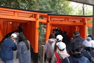 Pour finir en beauté, nous visitons le spectaculaire sanctuaire Fushimi Inari-taisha et ses 10 000 torii vermillon qui serpentent à travers la montagne. Ces Torii ont été offerts par des commerçants ou des mécènes. Il peut en coûter jusqu’à 13000$ par Torii. Ce sanctuaire de 28 hectares qui contient 4 km de sentier, fut fondé en 711 et est devenu le principal lieu de culte de la déesse Inari. Ces fameuses portes sont tellement nombreuses qu’on a l’impression d’être dans un couloir sans fin, version shintoïste. Chaque torii a été offert par un particulier ou une entreprise en quête de chance et de prospérité (si seulement on pouvait en installer un dans notre salon !) Le sanctuaire est dédié à Inari, déesse des céréales, des fonderies, et même du commerce! Une déesse multitâche en somme. On dit qu’elle envoie ses messagers sur terre sous forme de renards blancs, qu’on retrouve d’ailleurs en statues géantes, gardant l’entrée du sanctuaire. Et dire qu’on pensait que seuls les chats dominaient le Japon !