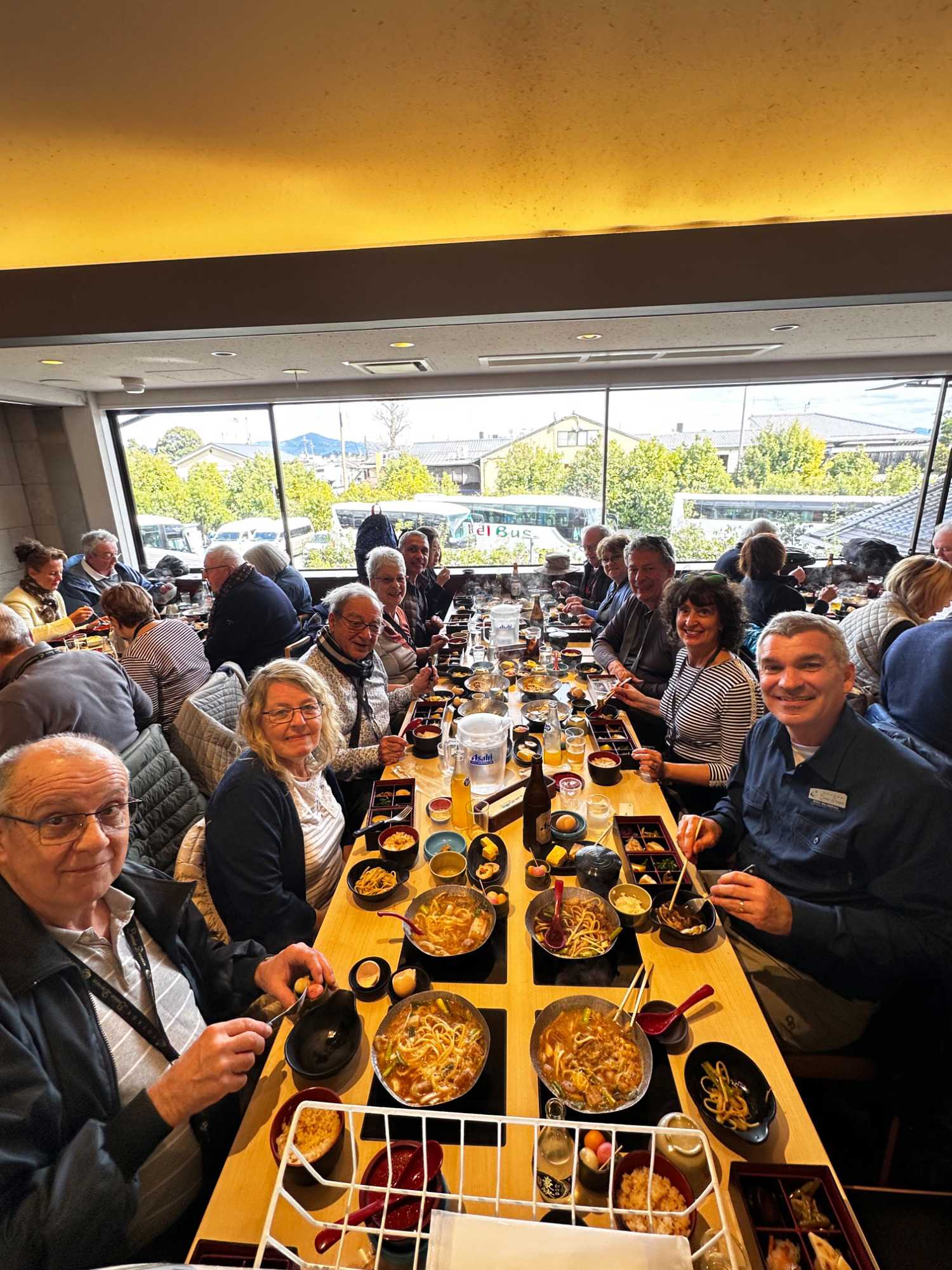 Après cette immersion dans la spiritualité et l’histoire, nous repartons en fin de journée vers 17h30, la tête pleine de souvenirs et les appareils photo gorgés d’images dignes de cartes postales. Kyoto, c’est un peu comme un bon film de samouraïs : on en ressort émerveillés, inspirés, et avec une furieuse envie d’y revenir. Quelle journée mémorable à tout point de vue! Nous sommes un groupe extraordinaire, nous rions beaucoup et certaines anecdotes mémorables passées au Japon resteront au Japon !