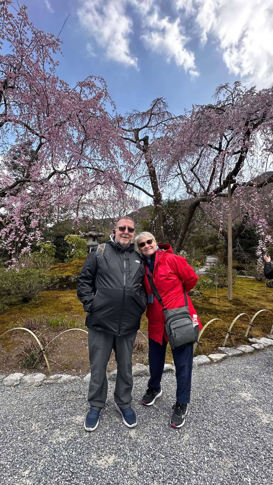 Après cette pause gastronomique, nous prenons la direction de la célèbre forêt de bambous d’Arashiyama. Imaginez une mer de bambous gigantesques qui s’élancent vers le ciel, formant un tunnel verdoyant baigné d’une lumière féerique. Ici, chaque coup de vent produit une symphonie naturelle où les bambous se frottent et s’entrechoquent harmonieusement. C’est à la fois apaisant et hypnotique. Le bambou est ici symbole de longévité et de prospérité, et selon la croyance japonaise, il repousserait les mauvais esprits. Nous nous sommes dit qu’après cette balade entourés de bambous géants, nous étions non seulement émerveillés, mais également blindés contre tout mauvais esprit ! Tout près de cette forêt se cache un autre trésor que nous avons eu l’opportunité de visiter en supplément grâce à Voyage Louise Drouin qui nous a fait découvrir ce petit paradis de beauté et de quiétude. Le temple boudhiste de Tenryū-ji, fondé en 1345 par le shogun Tkauji Ashikaga où l’on produisait du saké. Nous y avons visité son jardin datant quant à lui du 14e siècle. C’est une oeuvre majeure de design en matière de jardin japonais où un immense étang capte les reflets de la flore environnante particulièrement à l’automne quand les érables rougissent. De très anciens cerisiers nous ont offert un magnifique spectacle de floraison. On y admire le jardin sec dont les sillons de roches rappellent les vagues de la mer. Relaxation assurée.