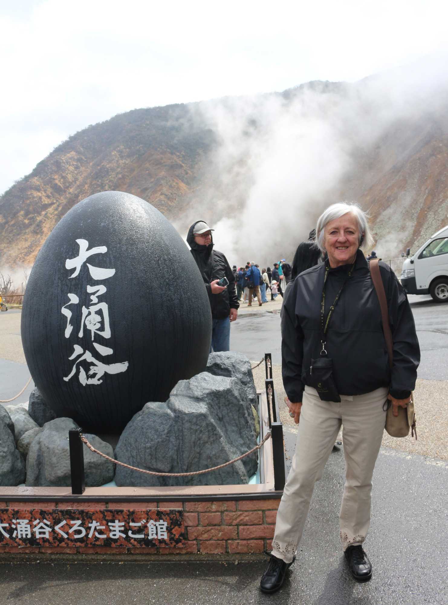 Notre premier arrêt sera dans la vallée d’Owakudani, un des joyaux volcaniques d’Hakone. Ici, la terre semble encore bouillonner sous nos pieds, libérant d’épaisses vapeurs de soufre qui nous rappellent que la nature garde toujours le dernier mot. Entre émerveillement et légers pincements de nez en raison de l’odeur, nous découvrons les fameux œufs noirs cuits dans les sources chaudes. Une légende locale affirme que manger l’un de ces œufs rallonge la vie de sept ans… Certains se laissent tenter (on ne sait jamais !), tandis que d’autres préfèrent immortaliser la scène en photo, sans risquer d’altérer leur haleine.
