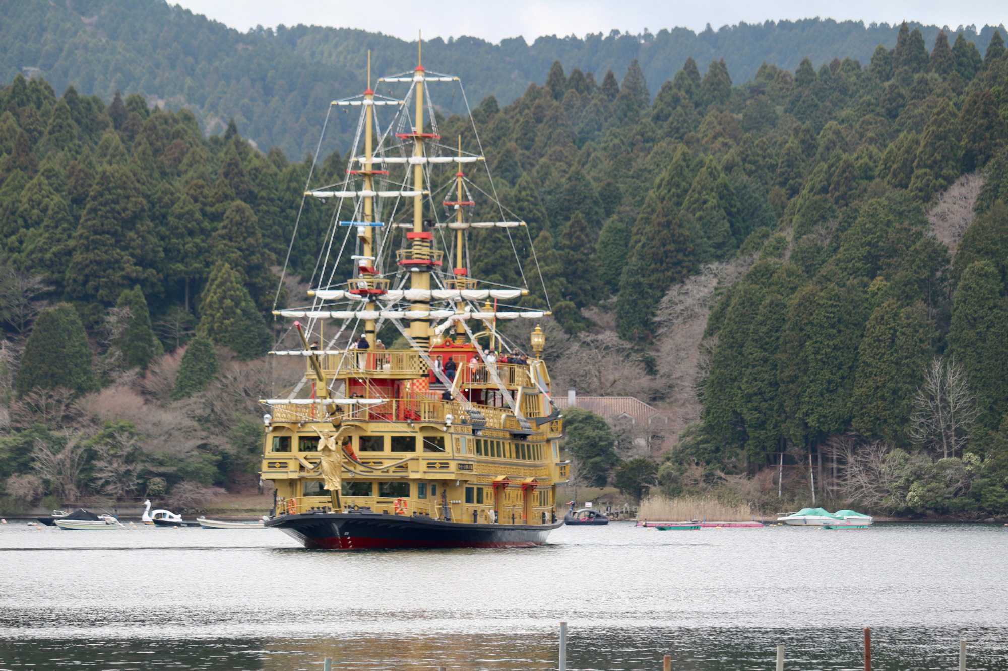 Sur la route qui mène à Hakone, située à 75 km du port de Shimizu, nous gravissons le mont Owakudani, pour nous diriger vers Hakone, importante station balnéaire où les japonais adorent passer des vacances en montagne pour se ressourcer dans les nombreux resorts ou ryokan. Nous faisons notre entrée dans le cratère où se situe Hakone par un tunnel autoroutier. Un bonne partie du cratère est maintenant occupée par le lac Ashi sur lequel nous avons fait une traversée en bateau afin de rejoindre notre autocar qui nous attendait sur l’autre rive. Ce bateau est aussi une occasion unique d’avoir une vue imprenable sur le tournant et, normalement, apercevoir ce magnifique Fujisan, la plus haute montagne du Japon, formée d’un cône volcanique parfait de 3776 m de hauteur encore couvert de neige depuis novembre dernier. 2024 fut la date la plus tardive à laquelle les premières neiges sont tombées sur son sommet depuis le début des relevés en 1894. Sa dernière éruption, quant à elle, remonte à 1707. Fujisan est vénéré au Japon et constitue naturellement un emblème incontestable.