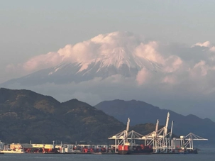Il est 5h45 du matin, nous venons d’accoster au quai de Shimizu. Je reçois une notification sur mon téléphone cellulaire de la part de Jean : Marie, il faut tout de suite monter sur le pont, Il est là !! Ohhh, mais il parle de Fujisan. Je m’habille en vitesse, j'agrippe ma caméra, ma “grosse lentille” et mon téléphone. Je sors sur le pont du 11e et là … Wow! La totalité des 3776 m d’altitude du Fujiisan est dégagée, nous le voyons clairement. Eric et moi nous pinçons d’avoir cette vue du Fujisan devant nous. Il fait un temps magnifique.