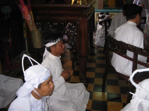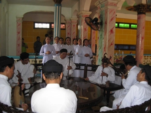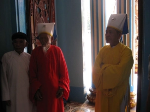 Nous sommes arrivés au moment de la grande messe de l'avant-midi. Les hommes et les femmes entrent dans le temple par des portes séparées. Les caodaistes portent des tuniques de couleur différente ce qui indique leur rang dans la hiérarchie de l''église et leur attachement à leur religion (bouddhistes en jaune, taoïstes en bleu, confucianistes en rouge) mais certains fidèles sont habillés de blanc.