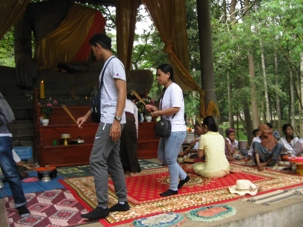 Durant la visite, il y avait des moines qui invitaient les touristes qui passaient près d’eux à venir les rencontrer afin qu’ils attachent une cordelette à leur poignet. Il faut garder celle-ci jusqu’à ce qu’elle tombe par elle-même ou se détache. Après la cérémonie qui dure quelques instants , le moine nous asperge avec de l’eau pour nous bénir.