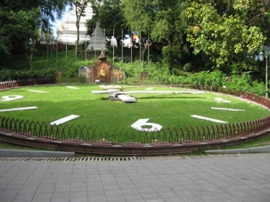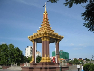 Sur le chemin de notre hôtel nous avons vu quelques monuments historiques de la capitale dont le monument de la victoire. Magnifique édifice en béton rouge brique, il est parfois appelé monument de l'indépendance. L'édifice est bâti sur 5 niveaux. Il a la forme d'un « stupa », monument funéraire bouddhiste, style grand temple khmer. Il est coiffé par une centaine de têtes de dragons-nagas. Il fut conçu en 1958 pour commémorer l''indépendance du Cambodge, mettant fin ainsi à la période du protectorat français.