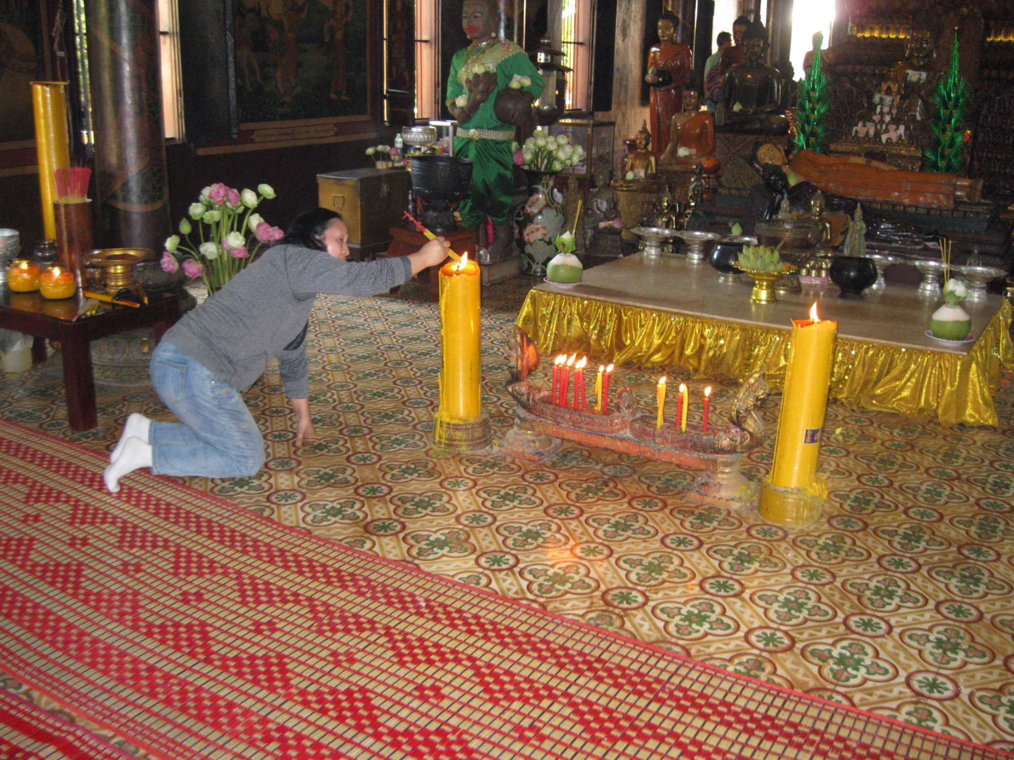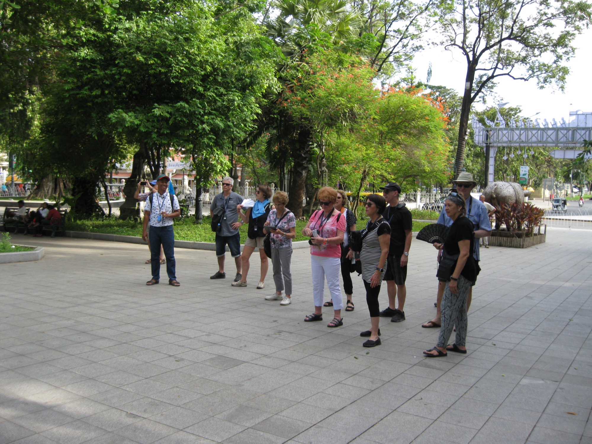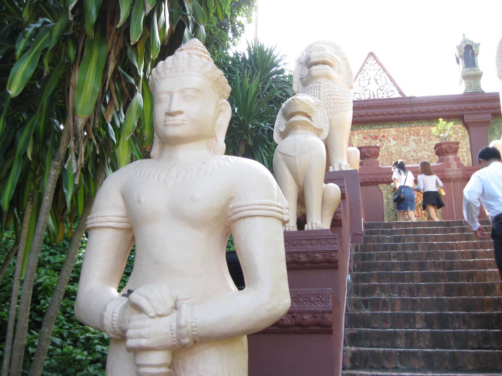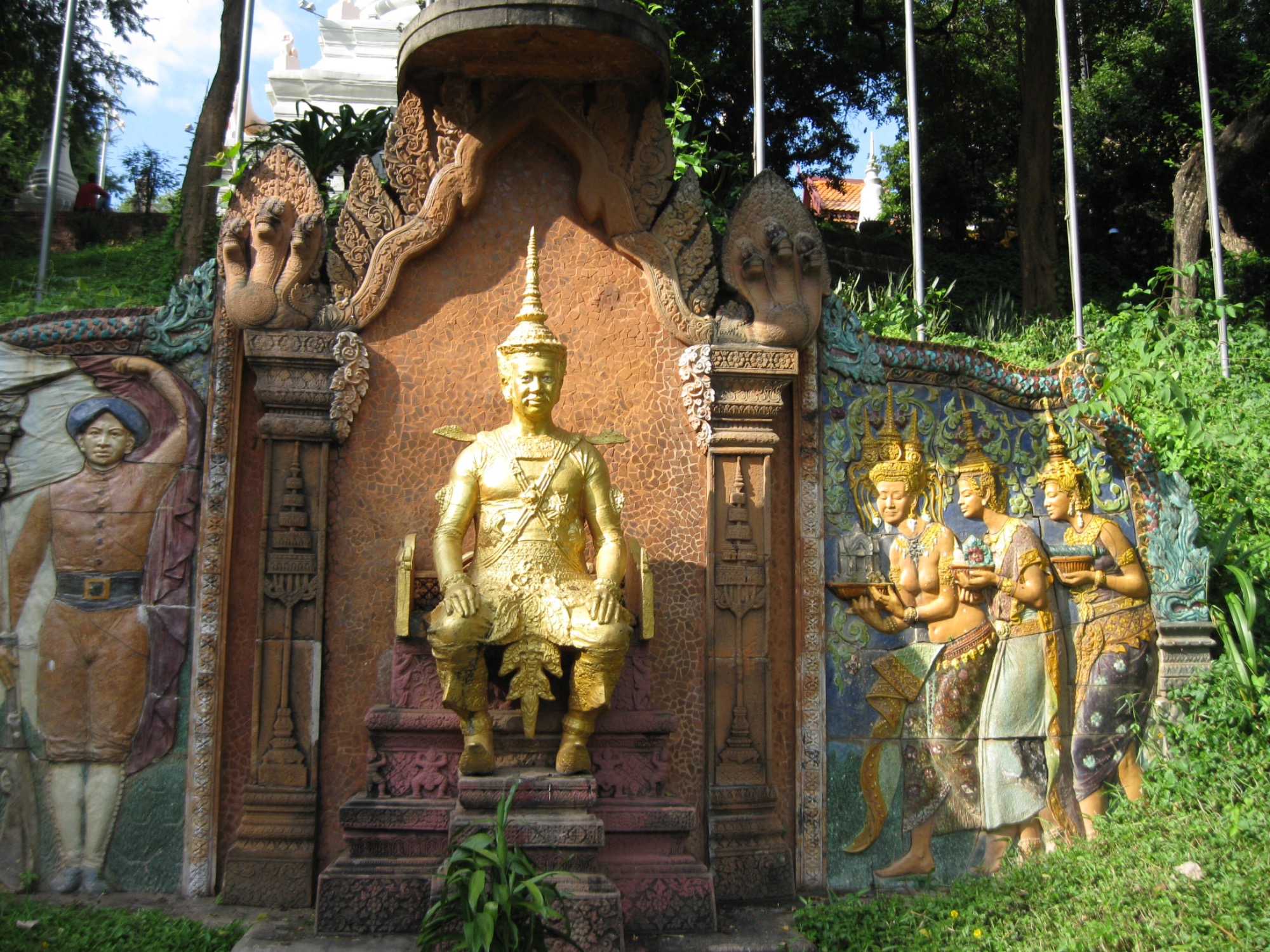 Nous avons commencé nos visites par la colline de Wat Phnom, qui est une des plus anciennes pagodes de la capitale. De « Phnom » qui veut dire « colline » et « Penh » d''une honorable dame qui aurait trouvé dans un tronc d’arbre flottant sur le Mékong, 4 statuettes de Bouddha qu''elle s’empressa de protéger en élevant une bute de pierres sur laquelle fut construit le sanctuaire. Pour accéder au temple, il faut escalader un escalier où quelques vendeurs d’oiseaux vous proposent de libérer quelques oiseaux moyennant quelques billets, ce qui permet de gagner quelques indulgences. Le nom de la capitale Phnom Penh provient de cette légende.
