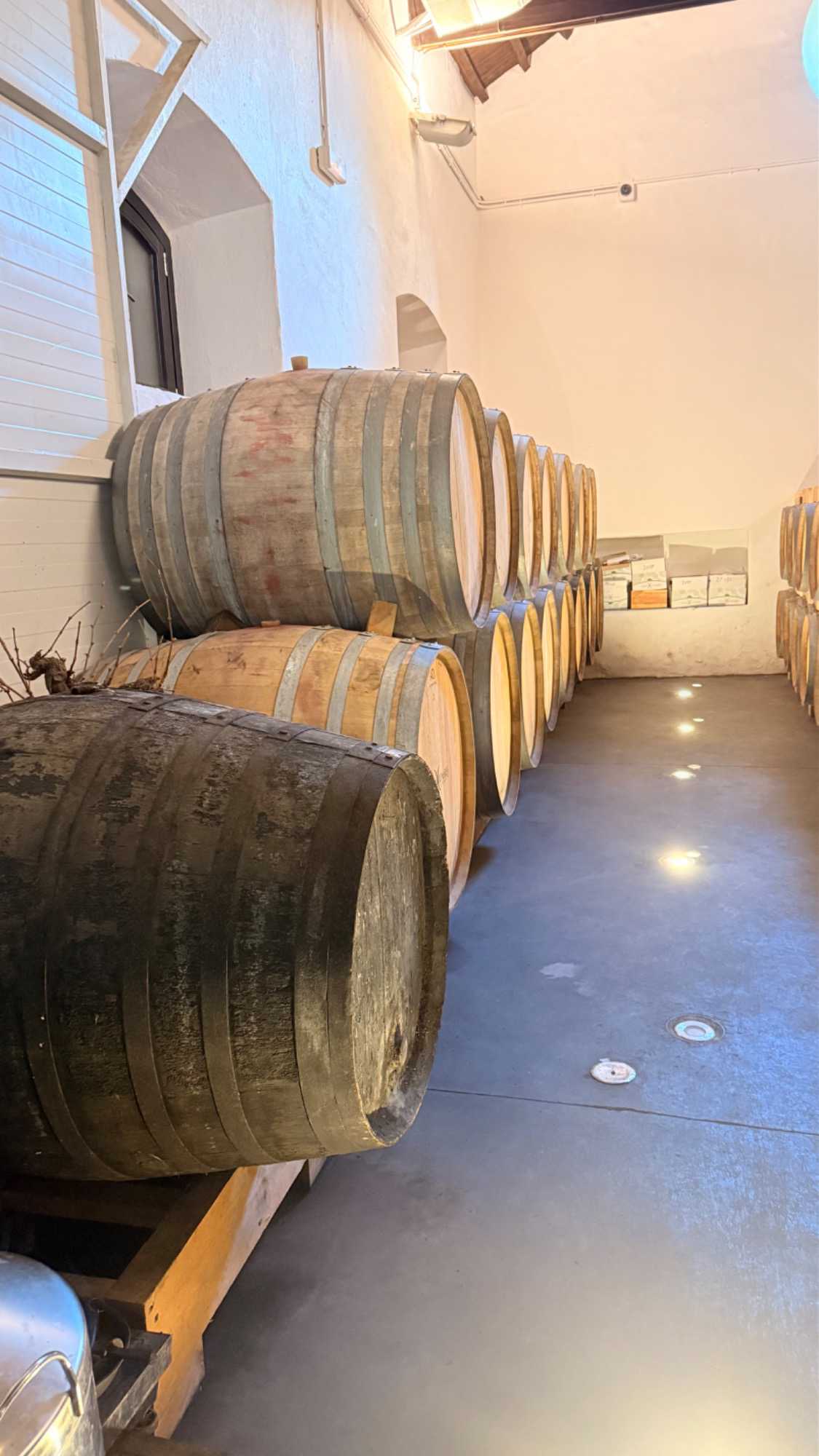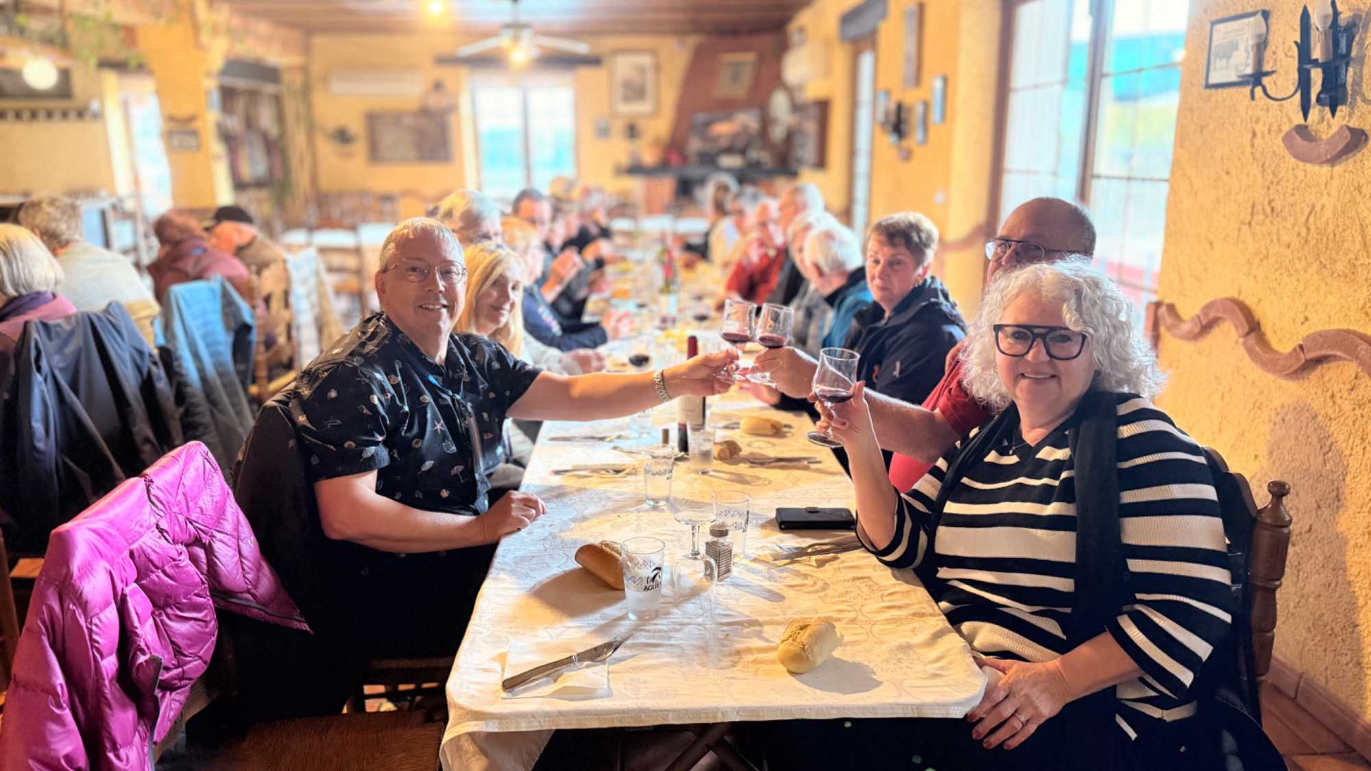 Daniel, notre super guide, nous propose ensuite une visite dans un petit vignoble familial de la région, las Bodegas Lunares. Nous sommes accueillis par Pedro, le propriétaire. Toutes les conditions idéales sont réunies ici pour produire d’excellents crus : les vents, l’altitude, des sols sablonneux et calcaires, des versants exposés au soleil, des chênes verts, du thym, du romarin, du ciste, tout cela donne des vins exquis, honnêtes, respectueux de la terre qui leur donne la vie et de l’environnement qui les abrite. Daniel, notre charmant guide, nous renseigne avec bonheur sur la production de ces vins, de la vigne au produit fini, en passant par la dégustation que nous avons bien appréciée. Je peux vous dire qu’après trois verres nous avions beaucoup de plaisir et que les décibels étaient beaucoup plus élevés dans la pièce et les joues un peu plus rouges et les conversations étaient animées.