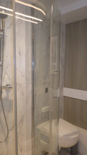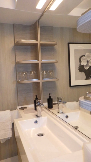 Beaucoup de suites sont dans la catégorie « Infinity Verandas », Wow ! Wow ! Wow ! J’adore cette chambre, dont le balcon a été transformé en verrière avec une fenêtre pouvant s’abaisser, ce qu’on ne trouvait jusqu’à maintenant que sur les plus luxueux navires fluviaux. Nous pouvons passer d’une cabine balcon (le jour) à cabine intérieure (la nuit) en 3 minutes, c’est le parfait mélange.