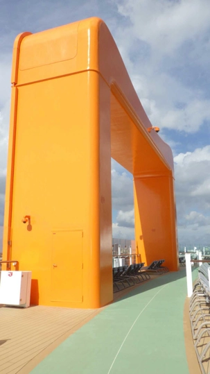 Le Magic Carpet: une plateforme de couleur orange de 30 mètres de long sur six mètres de large, visible de très loin. Accrochée au flanc droit extérieur du navire, completement au-dessus de la mer, elle fonctionne comme un ascenseur sur quatre ponts différents et devient, selon sa position, un bar, une terrasse, un restaurant ou un débarcadère.
