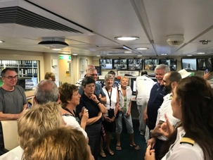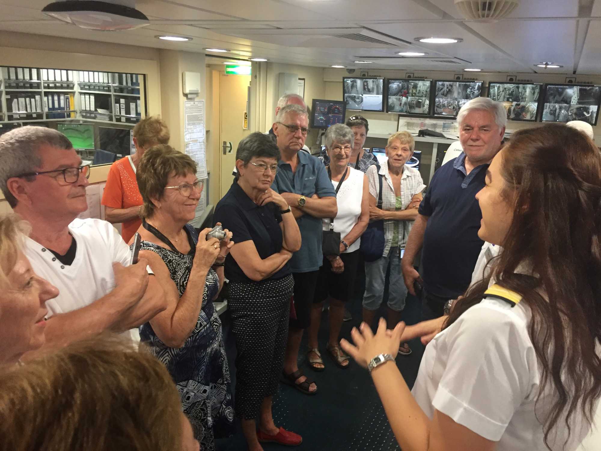 À 10h00 ce matin, nous avons donné rendez-vous à nos voyageurs pour une visite privée de la salle d’opérations des machines. Un officier nous y attendait ainsi que Nicole, l’employée multilingue du navire. En entrant dans la pièce de contrôle, on voit plein d’écrans d’ordinateurs et d’écrans qui nous montrent les différentes « machines » qui font fonctionner ce grand navire, en temps réel. Nous apprenons beaucoup par ce que nous dit l’officier ainsi que par nos diverses questions. On nous parle même de l’approvisionnement en eau potable et comment on se débarrasse des eaux usées, du nombre de tonne de « combustible » utilisé par jour,… Nous sommes très intéressés et ça parait. Nous avons vu tout un monde caché habituellement aux clients, mais fort intéressant.