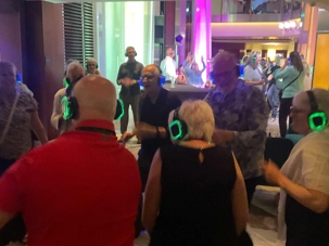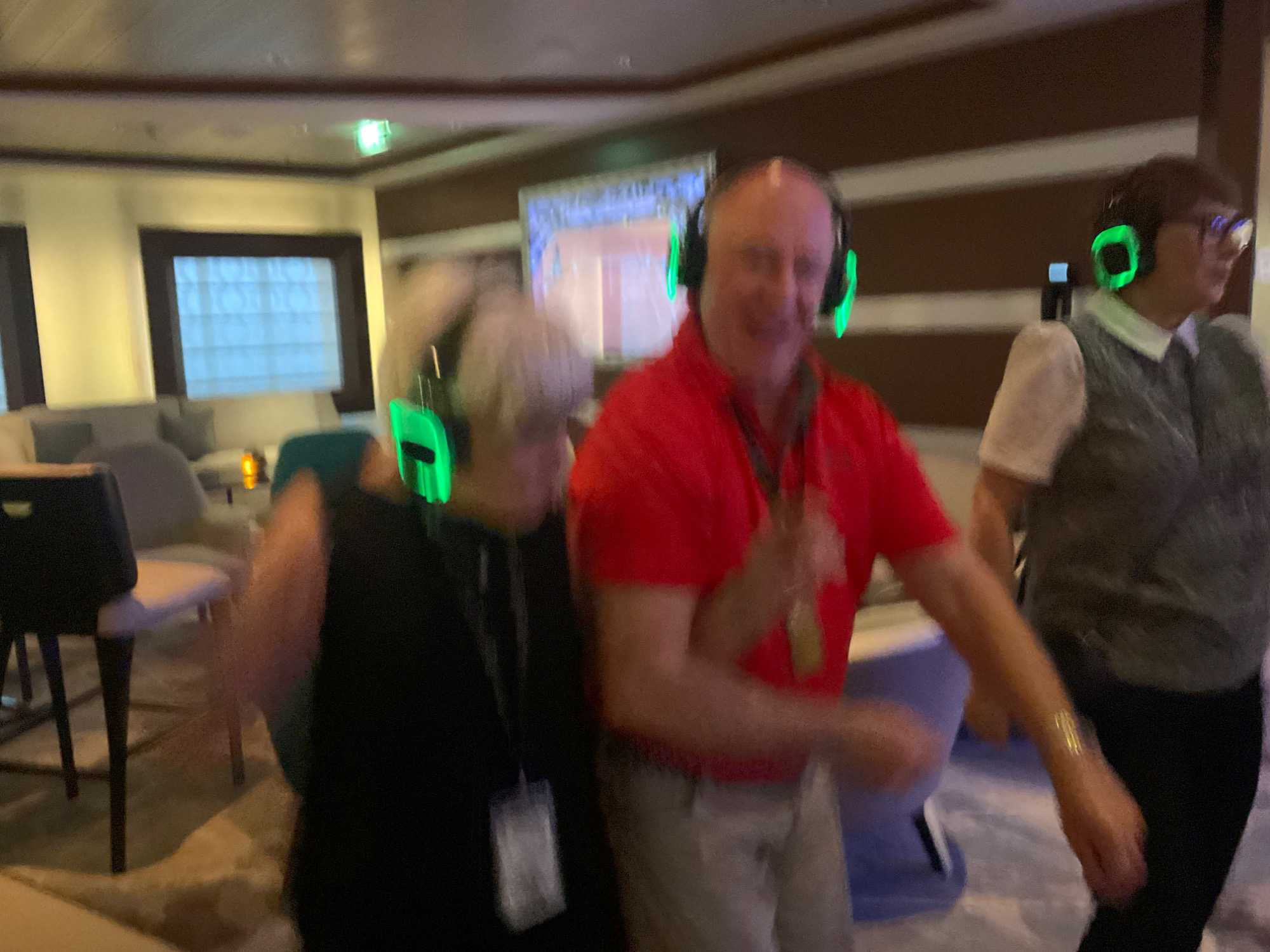 Mais attention, impossible d’aller se coucher le ventre plein. Que diriez-vous d’aller faire quelques ‘’steppettes’’? Une quinzaine de voyageurs se sont retrouvés à la discothèque silencieuse. Chacun avec ses écouteurs sur les oreilles, son choix de trois musiques et c'est parti la danse. Les différentes sortes de danses sont permises, les mouvements s'effectuent selon que vous écoutez la musique en bleu, jaune ou vert. On ajuste les pas et en avant la musique! Ouf! Quel groupe dynamique on a ! Voyez par vous-mêmes sur les photos. Vous auriez vous aussi voulu être avec nous!
