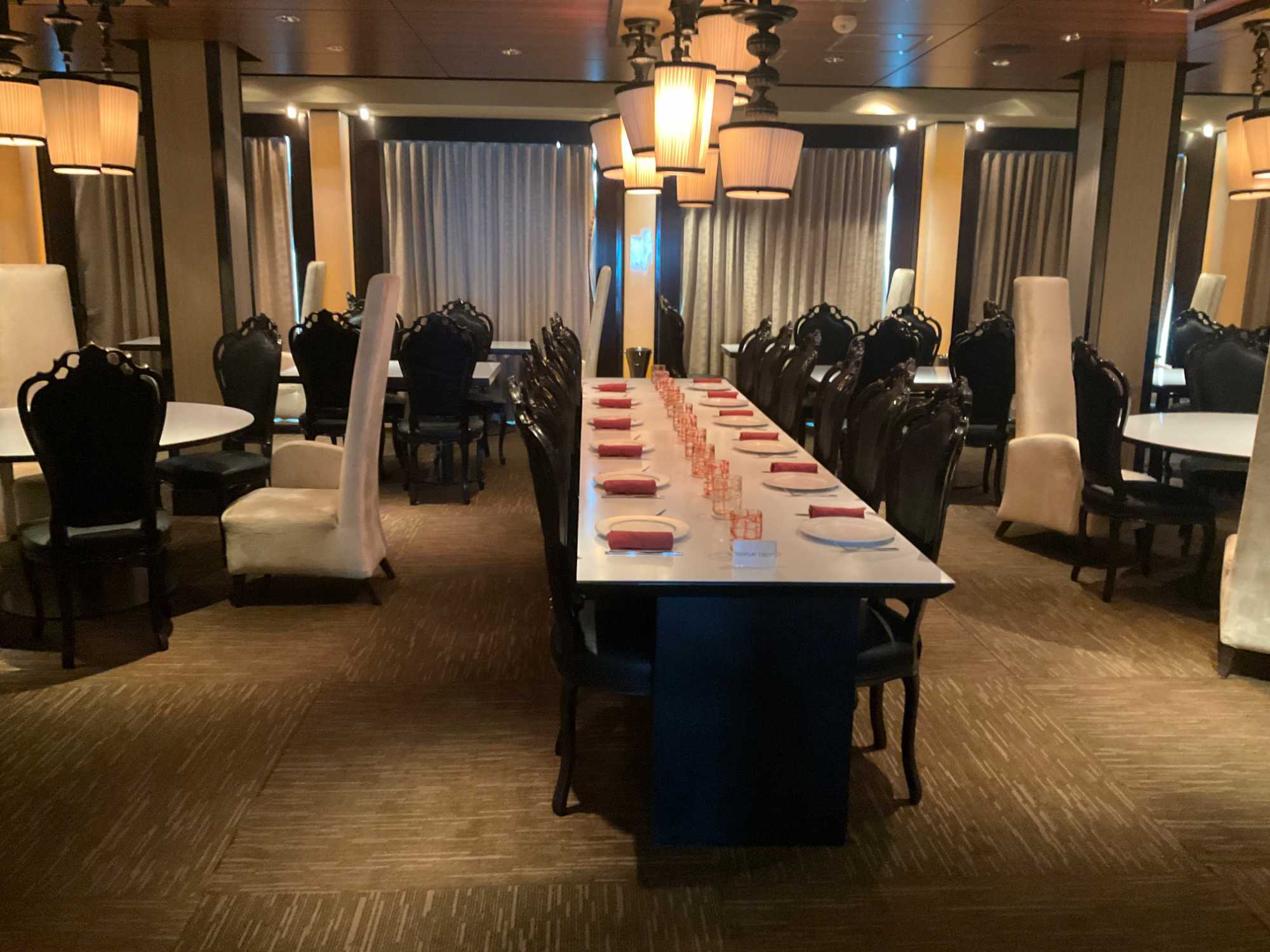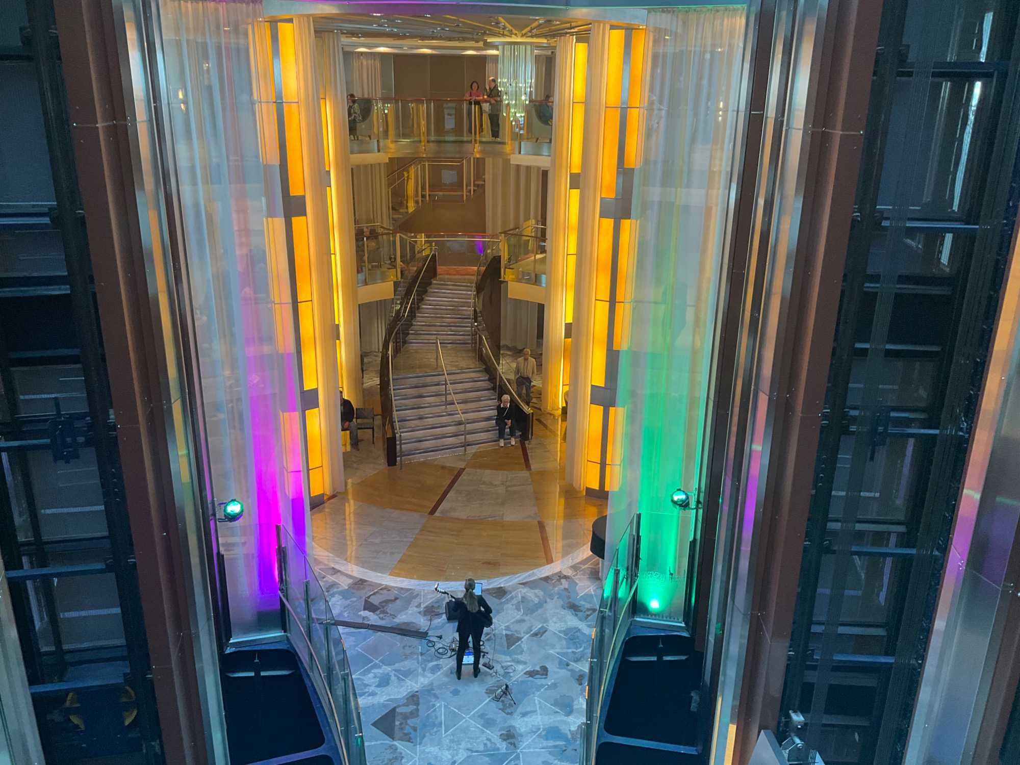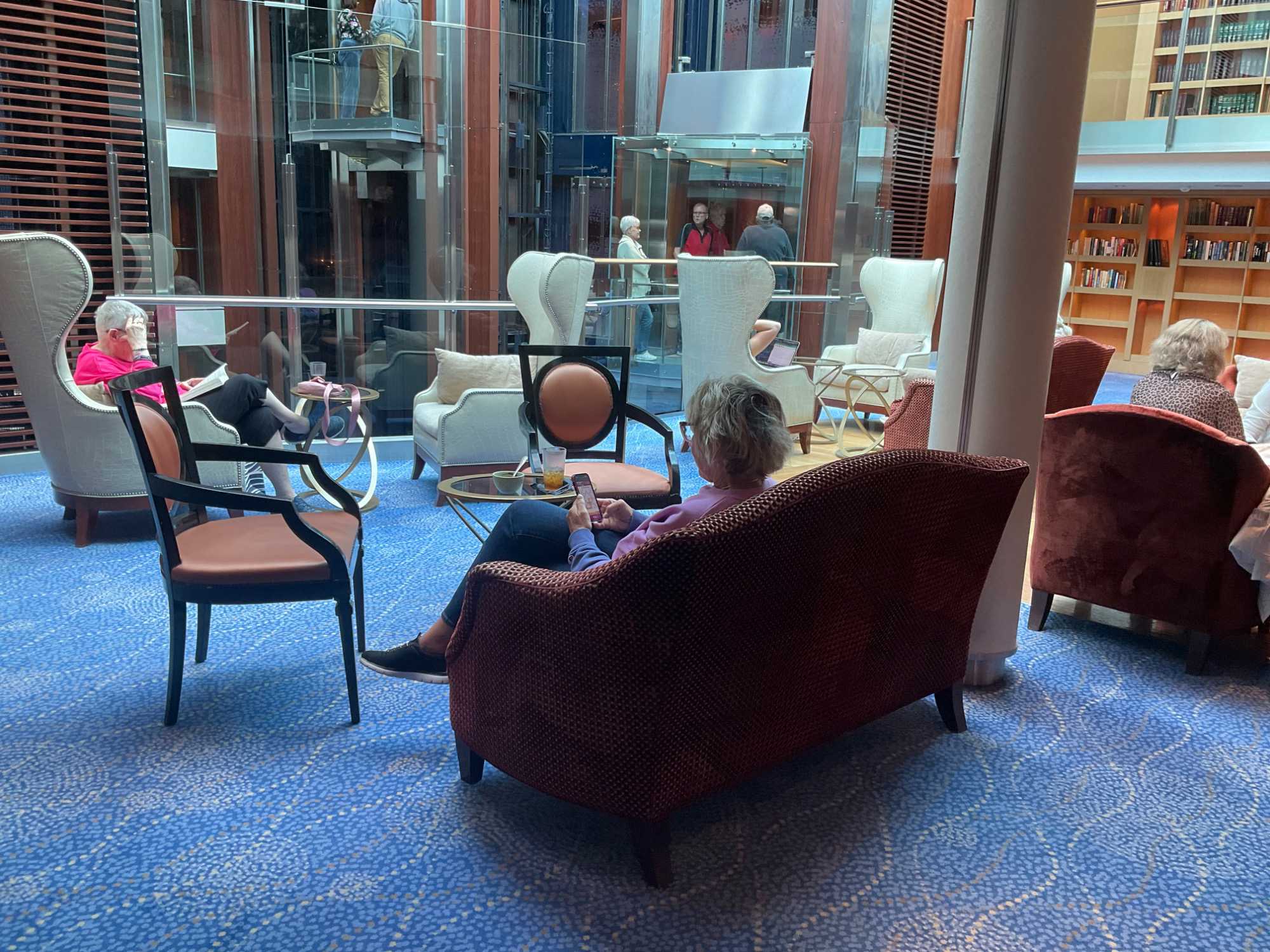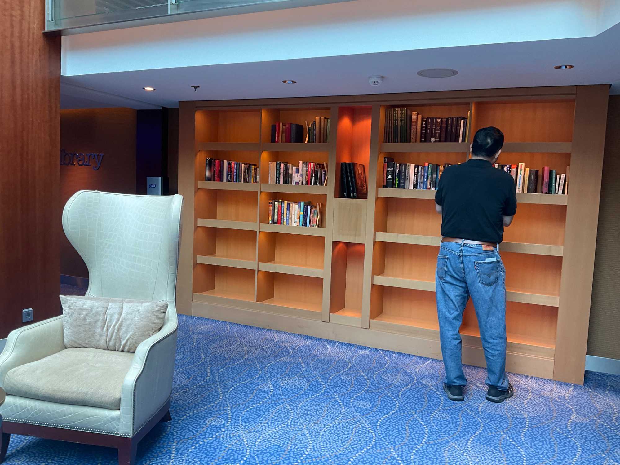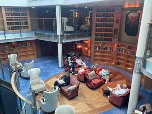 Mais j’avoue que la partie la plus impressionnante à mes yeux est la bibliothèque ouverte sur l’agora et ce sur 2 étages; un endroit idéal pour lire ou simplement pour relaxer, une œuvre d’art architecture. Un autre endroit zen que nous souhaitons utiliser demeure le Solarium. Pas de vent, pas de pluie grâce à son toit de verre, température idéal et piscine peu fréquentée avec ses spas. On vous reviendra sûrement sur cet espace invitant. Le centre de soins de santé et d’esthétique nous semble tout aussi intéressant. Et on a trouvé l’endroit où on ira danser, une grande piste de danse pour la discothèque.