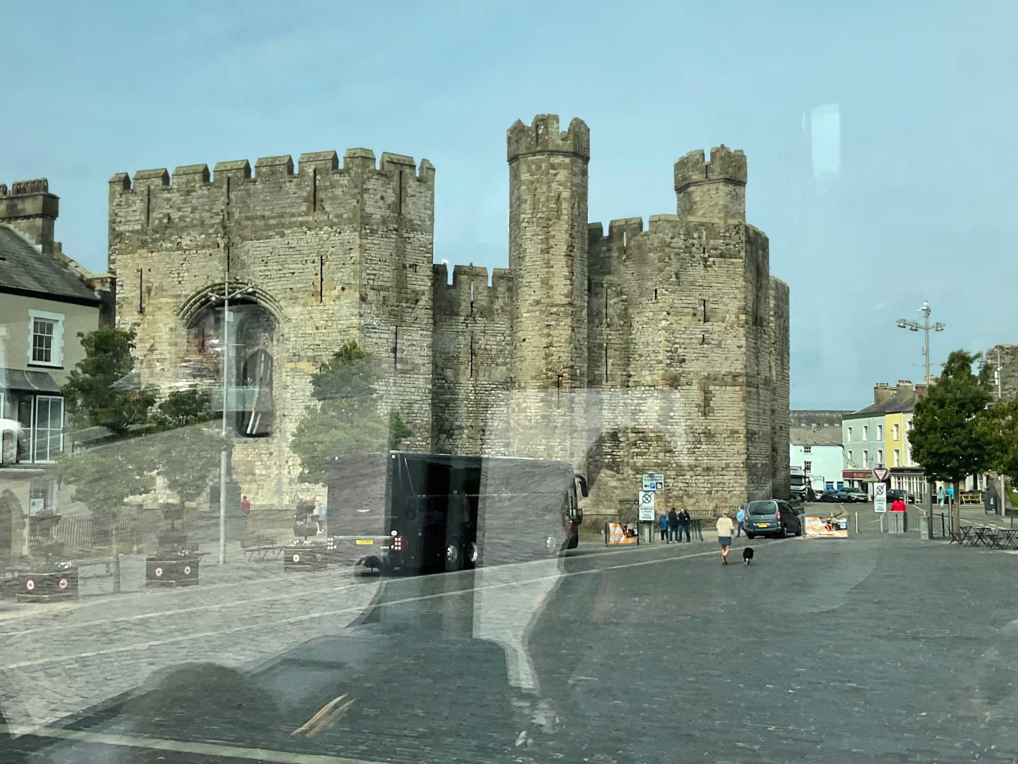 Direction l’enceinte de Caernarfon. Lors de notre passage, on voie à côté de nous, une muraille défensive médiévale, construite entre 1283 & 1292, sous le règne d’Édouard Ier. L’enceinte et ses huit tours font parties du Patrimoine Mondial de l’UNESCO depuis 1986. Nous les dames, on aurait l'impression d’être Lady Marianne dans ce gigantesque château. Tous les éléments ressemblent à ces châteaux d’antan. Notre Robin des bois viendra-t-il nous sauver? En plein coeur de la ville, cette incroyable forteresse médiévale a été construite sur une période de 47 ans soit de 1283-1330. Le roi Édouard Ier d'Angleterre avait le même problème que l'Empire romain (et possiblement Trump et Poutine en des temps plus modernes) : contrôler les habitants de l'Arfon et de l'Île de Môn. Cette grande bâtisse de pierres que l'on voie de notre autocar, devint rapidement le symbole de la domination anglaise. Notre guide nous dit que le maître maçon employé par Édouard Ier, Jacques de Saint-Georges, a utilisé pour modèle les murailles de Constantinople, le roi s'était engagé dans la cause des Croisades pour sauver le Royaume de Jérusalem. Son fils, le futur Édouard II d'Angleterre, naquit ici-même à Caernarfon en 1284. Les Gallois avait refusé qu'un Anglais les dirige, Édouard Ier avait promis de mettre à leur tête un homme né en terre galloise et ne parlant pas anglais. C'est ainsi qu'il leur présenta le bébé né à Caernarfon et ne parlant pas un traître mot d'anglais! Edouard 1er a fait construire pas moins de17 châteaux. Celui-ci possède 12 tours octogonales donc beaucoup plus difficile à construite.