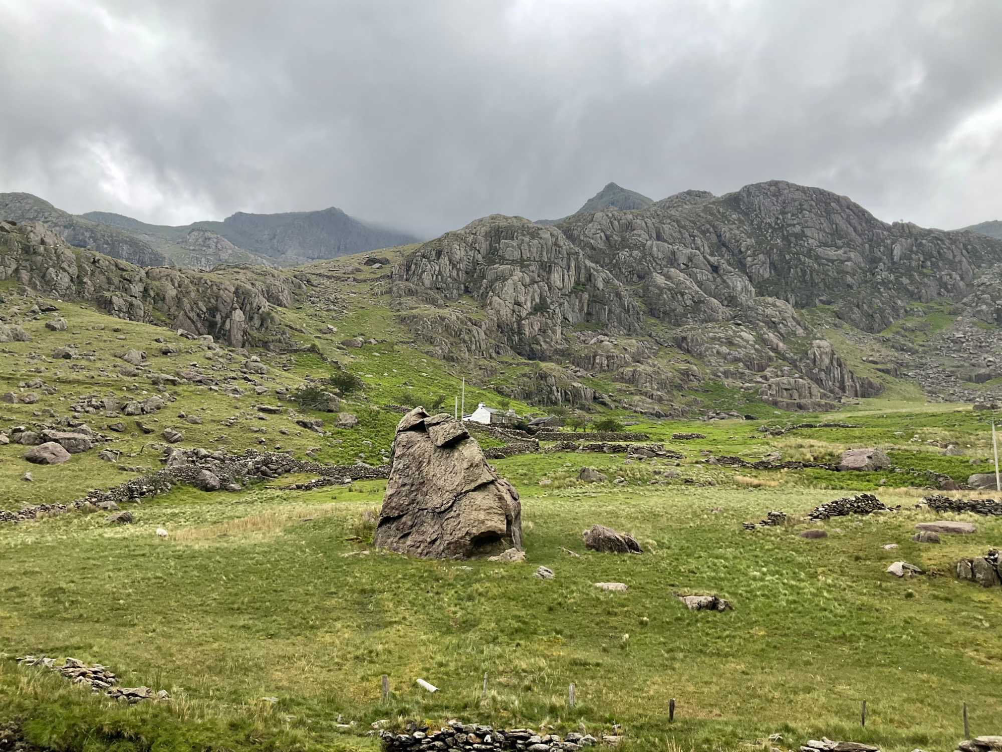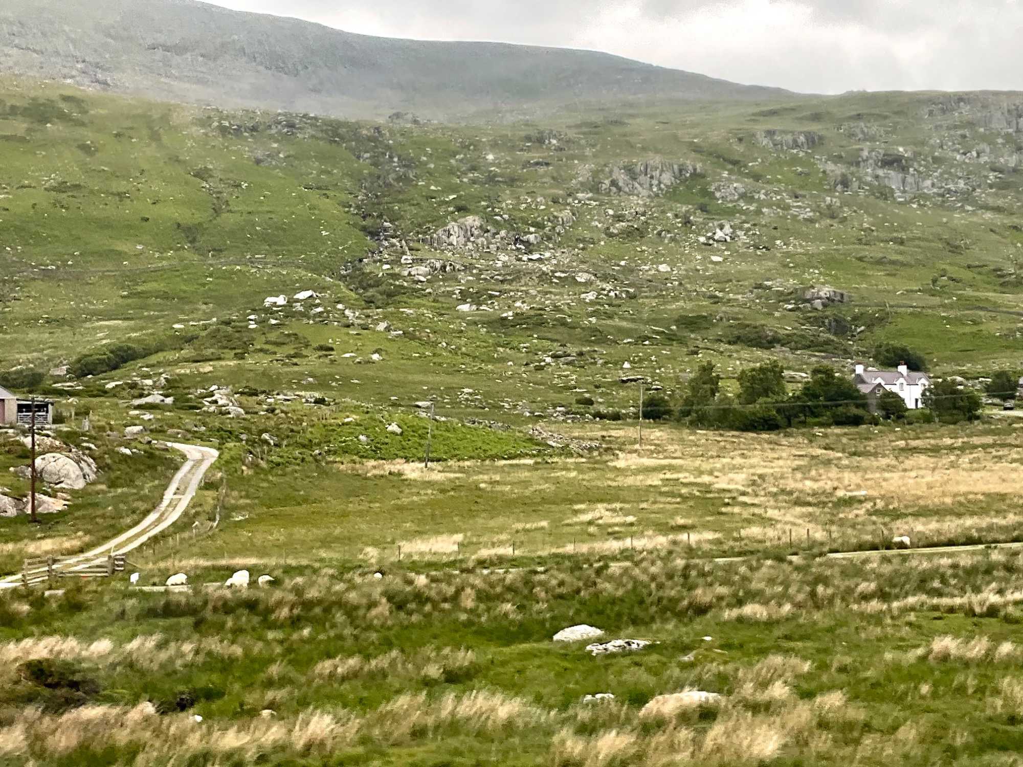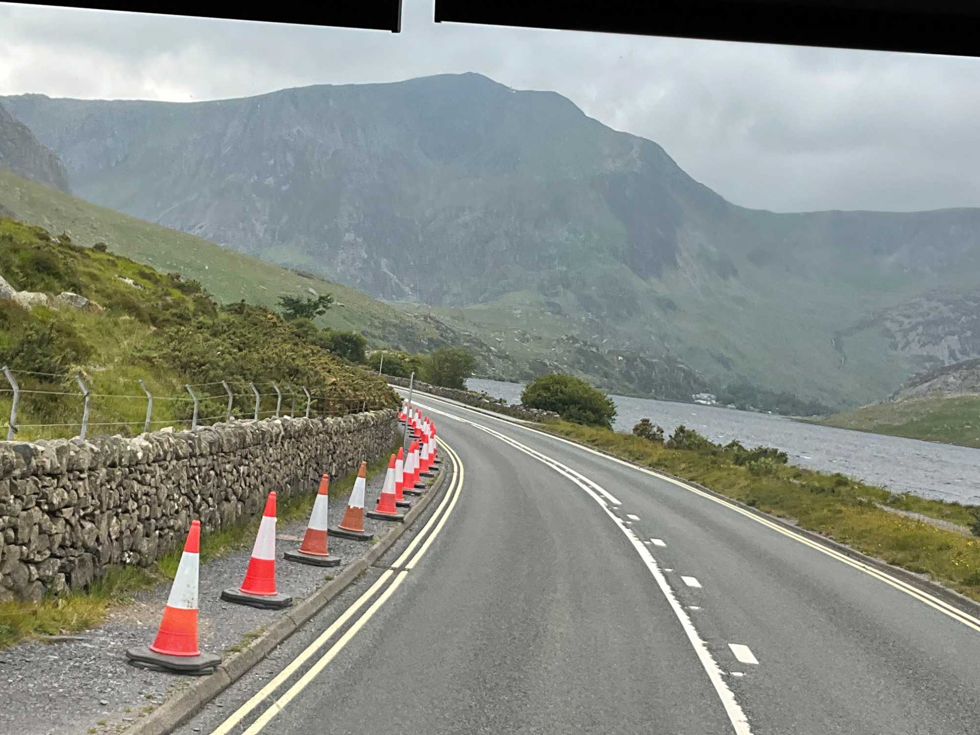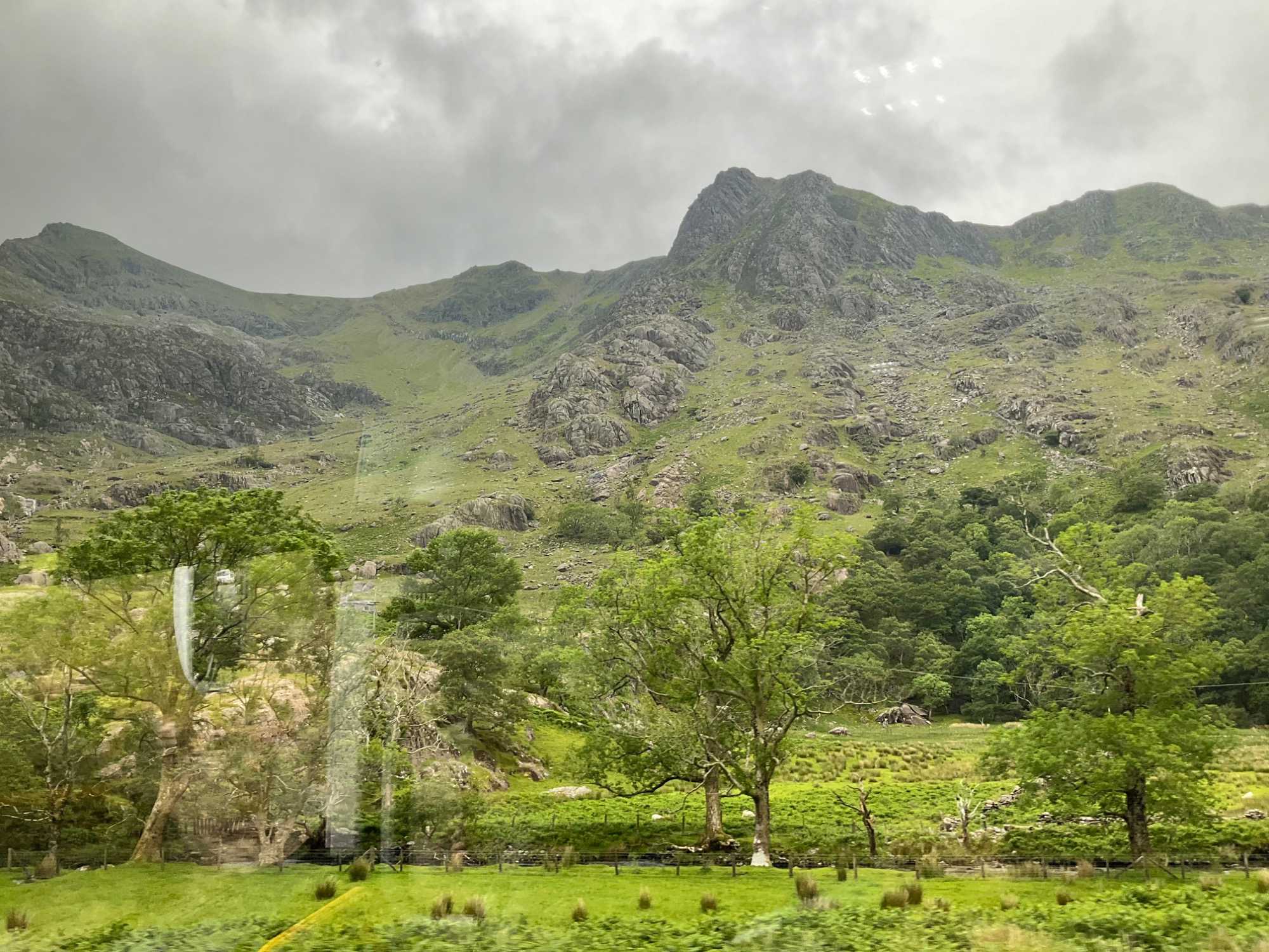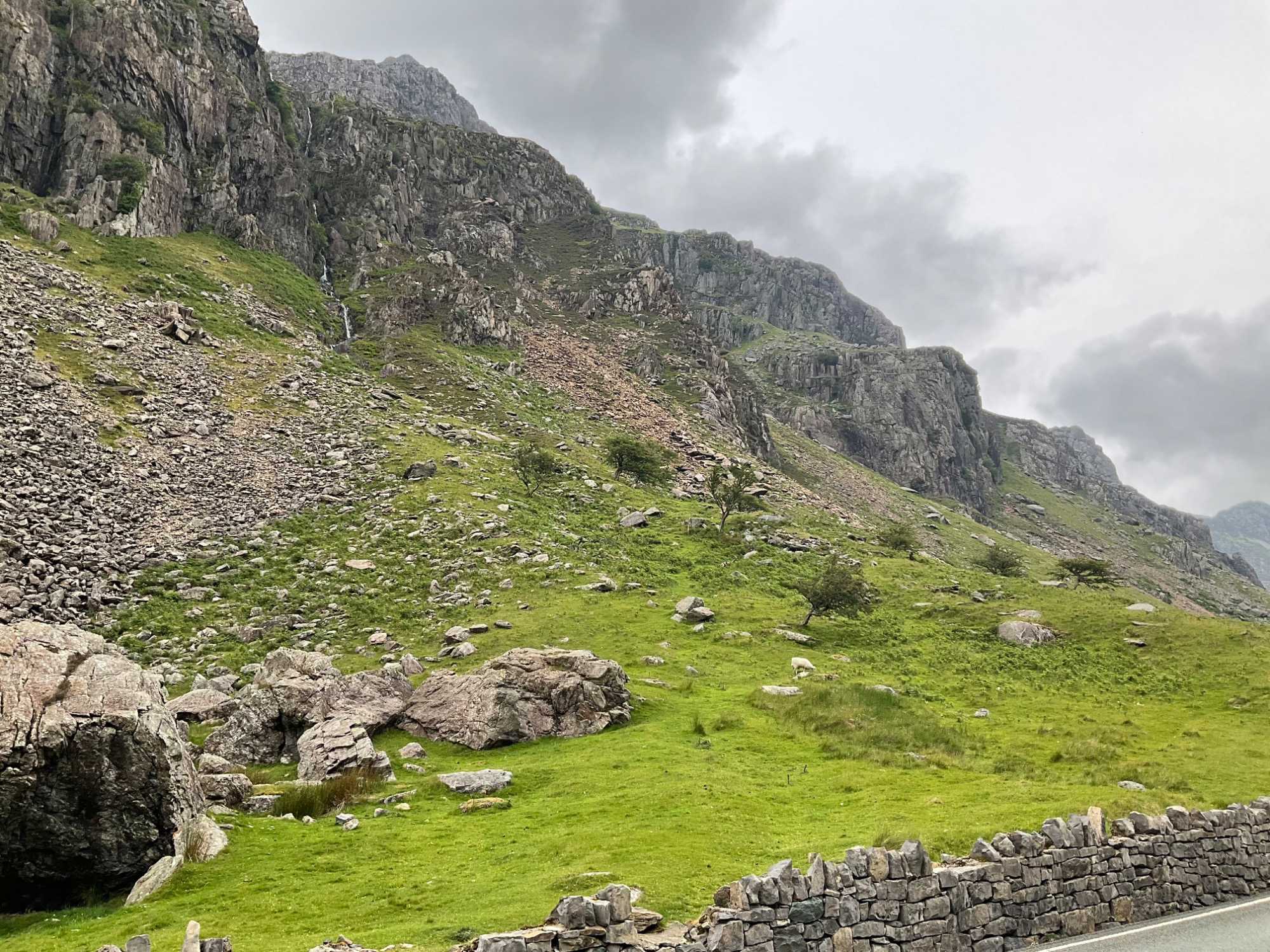 Sur le chemin du retour, nous avons l'opportunité de côtoyer les montagnes du Parc National de Snowdon, région protégée de vallées luxuriantes. C'est l'un des endroits les plus arrosés du pays. Ses roches, sont d'origine volcanique. Impossible de manquer le Mont Snowdon (appelé aussi le Grand Tumulus ou la montagne enneigée), dont le sommet culmine à quelques 1085 mètres d’altitude, ce qui en fait le deuxième plus haut sommet du Royaume Uni. Sa superficie de 2 130 km2 s'étend bien au sud des limites du massif. Les gallois avaient l’œil pour la préservation puisqu’il est devenu en 1951 le premier parc national gallois et le deuxième par la taille des onze parcs nationaux d'Angleterre et du pays de Galles. Le sommet offre un des plus vastes panoramas des îles Britanniques. Par temps exceptionnellement clair, il paraît qu'il est possible d'apercevoir les côtes d'Irlande, d'Écosse, d'Angleterre et de l'île de Man ; 29 lacs et 17 îles sont visibles ; enfin, il est possible de balayer du regard 24 comtés du Royaume-Uni et d'Irlande. Nous, on regardait droit devant car cette étroite route est accidentée et montagneuse ce qui la rend d'autant plus agréable à parcourir. Ce parc est constitué de milliers de roches, rochers, un endroit idéal pour l'escalade, on en a vu d'ailleurs qui semblaient en être à leur première expérience alors que Julie nous mentionne que le célèbre montagnard et explorateur néo-zélandais Edmund Hillary est venu s'entraîner sur ces pics avant d'être le premier homme à gravir l'Éverest.