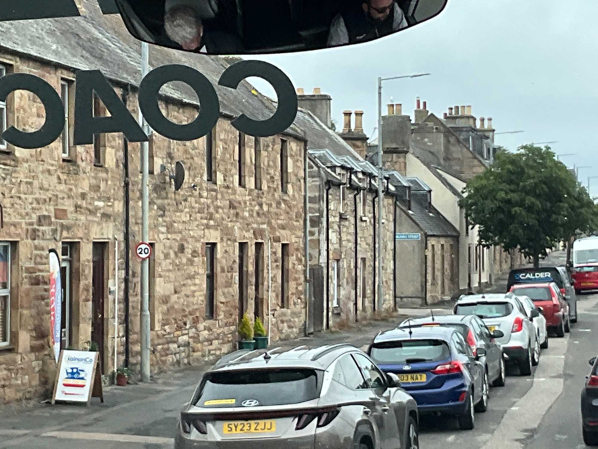 On passe à travers le village d'Invergrodon. On remarque déja les collines. Ici, la neige ne reste pas sur la terre. En 36 ans, la route n' a été bloqué qu'une seule fois par la neige. John nous fait remarquer que certains noms de rues portent des noms en langue des vickings qui sont passés par ici. Notre guide nous mentionne que des affiches ont été apposées avec l'appellation "Attention, conduite à gauche" car les touristes européens causaient régulièrement des accidents.