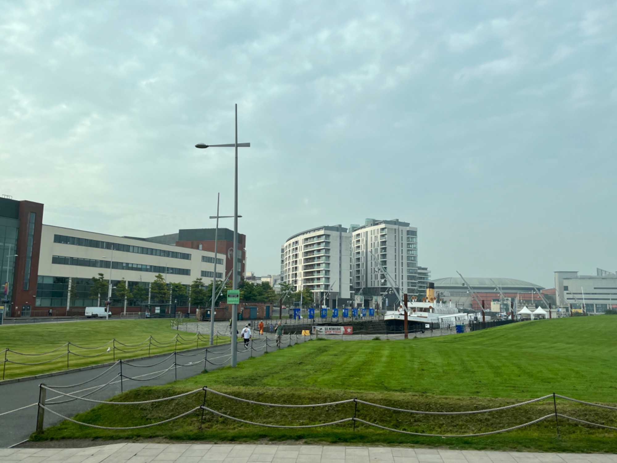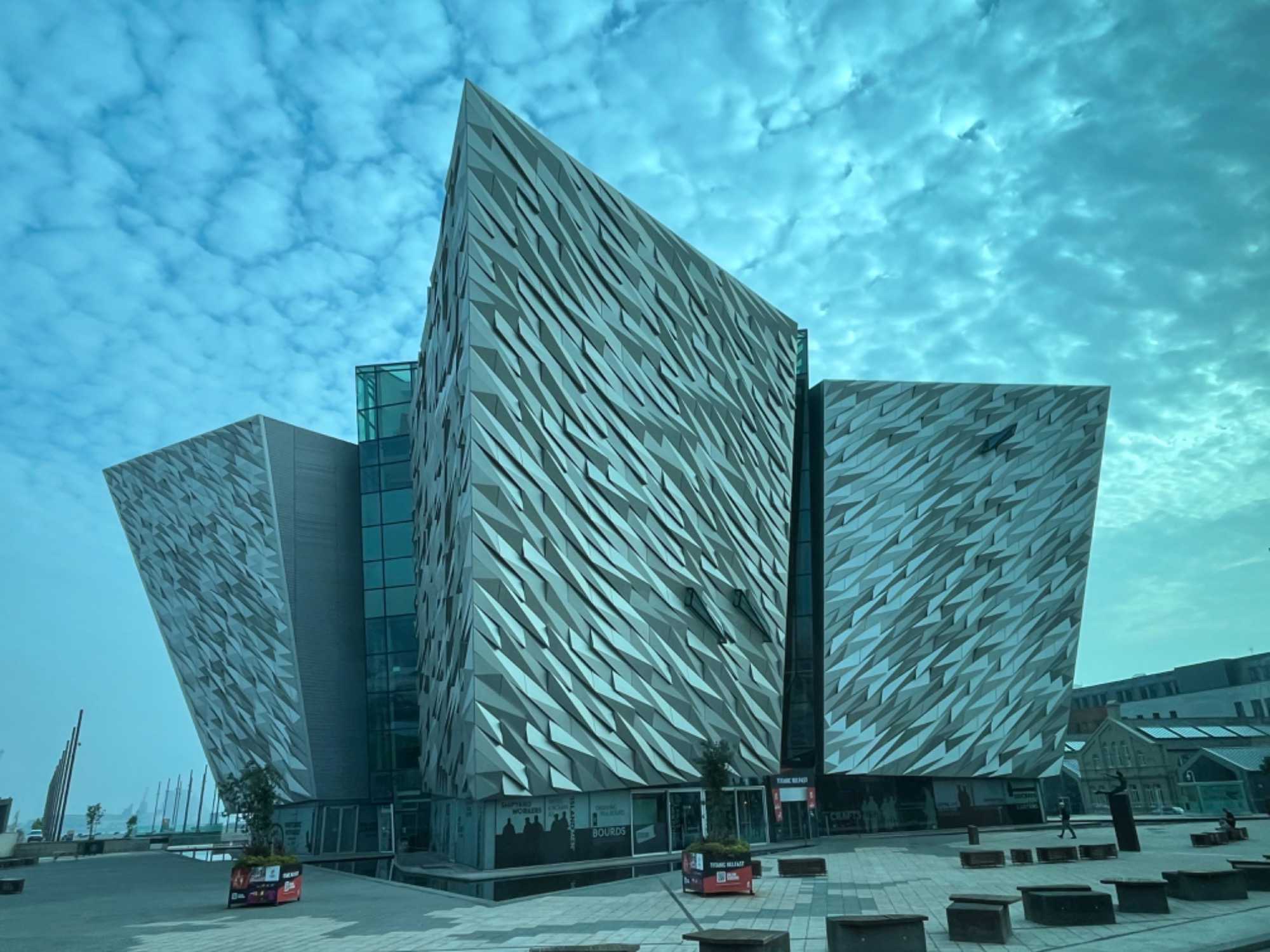 Nous faisons tout d’abord une visite panoramique de la ville de Belfast parce que, le matin, il y a moins de traffic dans cette ville de 350 000 habitants. Nous sommes passés à côté du nouveau musée construit il y a quelques années pour raconter l’histoire du Titanic. Pourquoi ce musée est-il à Belfast? Tout simplement parce que le Titanic y a été construit. C’est à Belfast, dans les chantiers navals de Harland & Wolf, que fut construit le Titanic, entre 1909 et 1911. C’est à cet emplacement même, sur les rives de la Lagan, que se dresse le musée du Titanic de Belfast, étincelant de mille feux sous le soleil, et dont la façade est censée évoquer la proue du légendaire paquebot. Inauguré en avril 2012, pour la commémoration des 100 ans du naufrage, c’est une réussite. Cet impressionnant musée à l’architecture étonnante a été construit ici pour revenir sur le passé industriel de la ville et sur l’histoire du Titanic en général. La construction des navires a déjà été extrêmement importante pour l’économie de la ville. Le Titanic Expérience est sans conteste un très beau musée, tant par son architecture que sa muséologie. Le musée est grand et les salles occupent de larges espaces. Pour ceux qui visitent le Musée, le billet d’entrée donne aussi accès au Nomadic SS actuellement en cale sèche juste en avant du musée. C’était le bateau transportant les passagers à bord du Titanic dans les ports où le Titanic n’avait pas la profondeur requise et c’est le seul bateau de la White Star Line existant encore aujourd’hui.