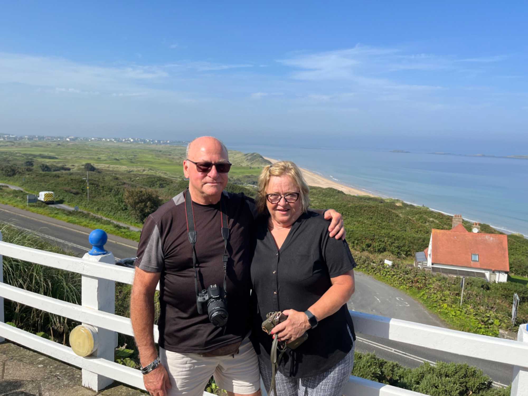 Ensuite, nous allons dans cette belle campagne verdoyante où se défilent sous nos yeux moutons et bétail. Notre tour en autobus du comté de Antrim nous fait passer par les villes de Ballymoney, le Chemin des Hêtres, Gracehill, Coleraine, Bushmills et Portrush où nous arrêtons pour le dîner au restaurant Royal Court Hotel. Cette ville est très populaire pour sa plage et son terrain de golf de renommée mondiale, le Portrush Country Club. Après avoir bien mangé, nous allons en bordure de la mer car notre prochaine destination est le château Dunluce situé sur les falaises en bordure de l’océan Atlantique. Il ne reste que les ruines de ce château ayant appartenu au clan des MacDonnell. On s’est contenté de faire un arrêt photo rapidement parce que nous voulons nous garder du temps pour le clou de la journée : la Chaussée des Géants. Cristina nous a raconté que la salle à manger du château est tombée dans la mer lorsque le château était habité, 30 mètres plus bas, lors d’un éboulement du roc la supportant et entraînant la mort de plusieurs personnes.