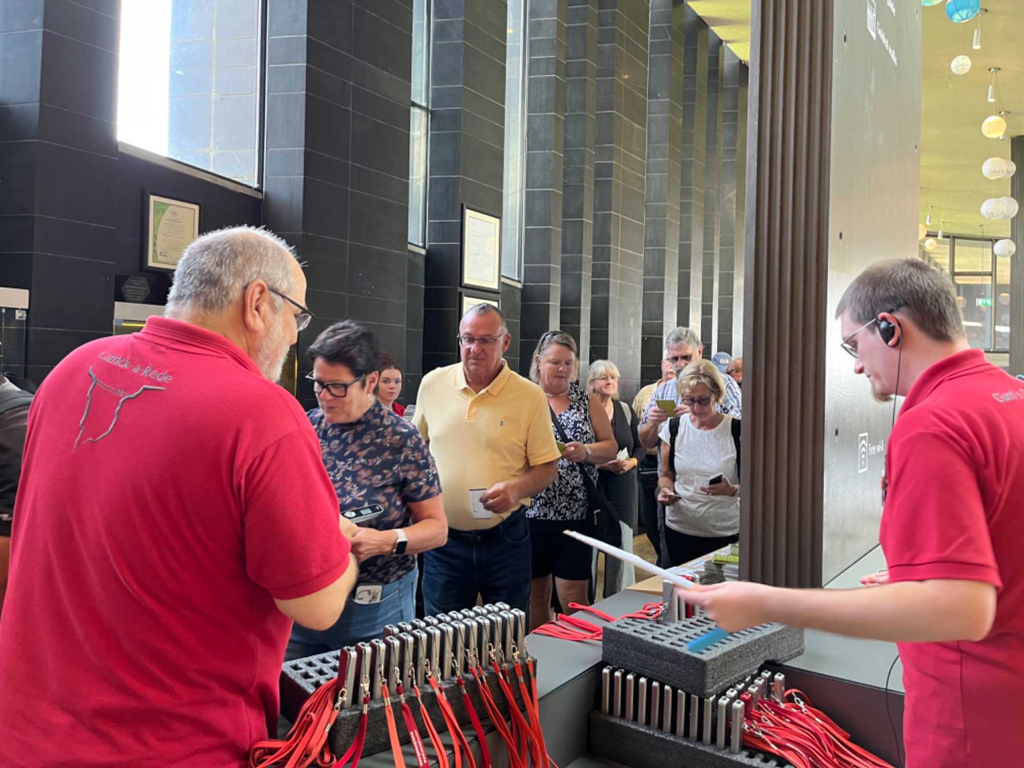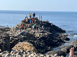 À 13h30, nous avons notre réservation de groupe pour visiter la Chaussée des Géants située en bordure de l’océan. La réservation pour les groupes est essentielle car cette organisation doit contrôler les entrées afin d’éviter d’y avoir trop de touristes en même temps pour assurer la sécurité des visiteurs dans leur découverte du site. Il s’agit d’une formation naturelle, d’un amoncellement de roche basaltique, résultat d’une éruption volcanique il y a plus de 60 millions d’années. Inscrit au Patrimoine mondial de l’Unesco, nous passons par le centre des visiteurs pour obtenir un audio-guide personnel et ainsi faire une visite guidée à notre rythme. Une navette électrique permet de parcourir la distance d’un kilomètre jusqu’à la Chaussée des Géants si on ne souhaite pas marcher ce trajet. Nous offrons aux voyageurs un billet aller-retour par la navette pour leur donner plus de temps au niveau de la côte.